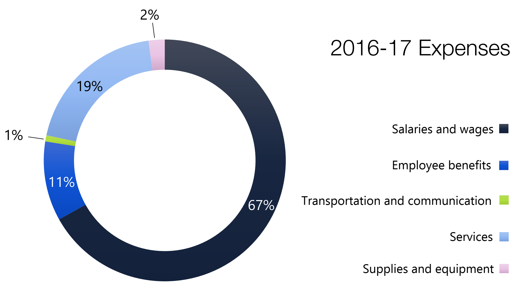 At the end of the fiscal year, the office had 17.5 FTEs. Most employees worked full-time for the entire fiscal year with the exception of two students. Actual expenses for salary, wages and benefits in 2016-17 were $2,027,474.