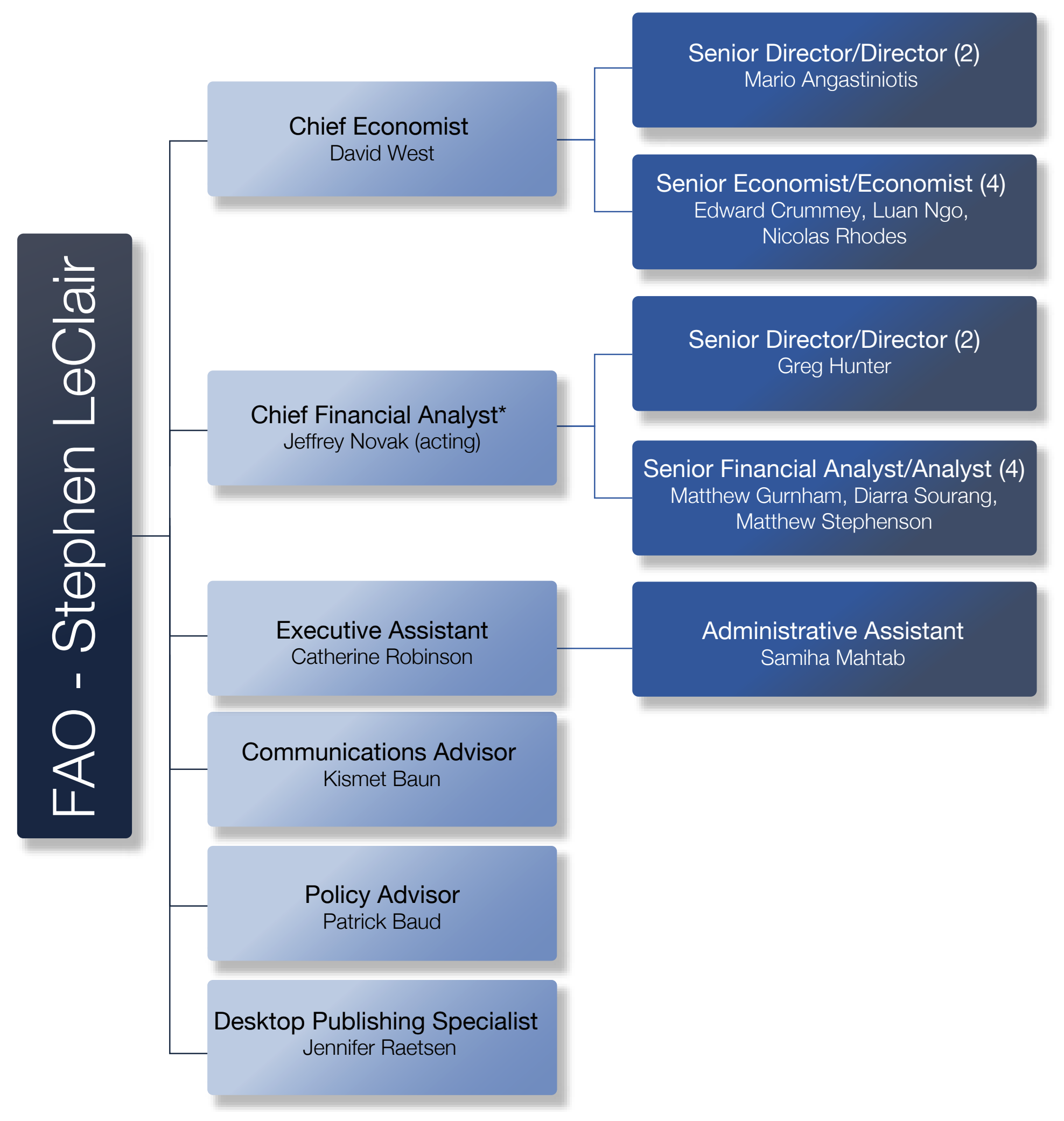 Under section 8 of the FAO Act, the FAO has the power to hire staff for the office. The FAO has staffed the office with employees who have both experience and advanced education in economics and/or finance. The FAO encourages employees to pursue professional development opportunities to continue to develop their expertise.