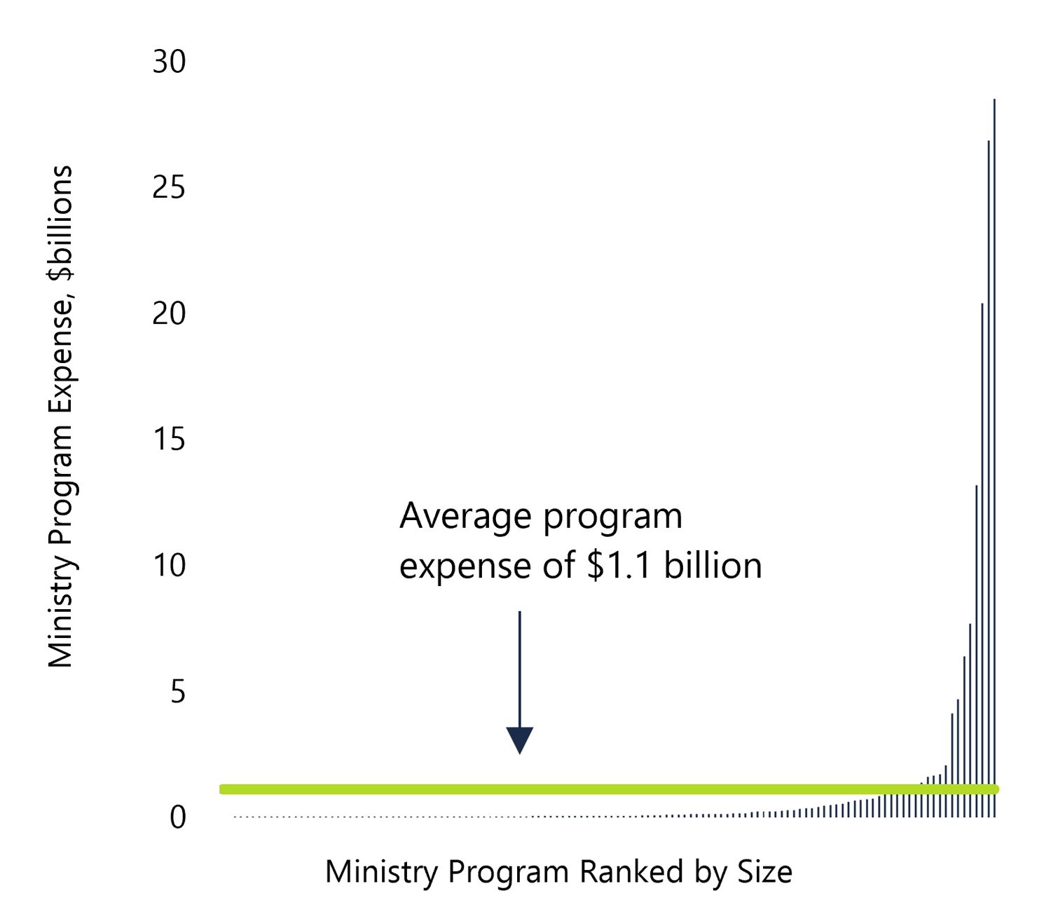 - Overall, the $140.7 billion in ministry program expense is to be allocated to 128 programs (known in the Estimates as votes) with a median program expense of $57 million and an average program expense of $1.1 billion. Moreover, five programs account for almost 70 per cent of requested Supply Bill expense spending.
