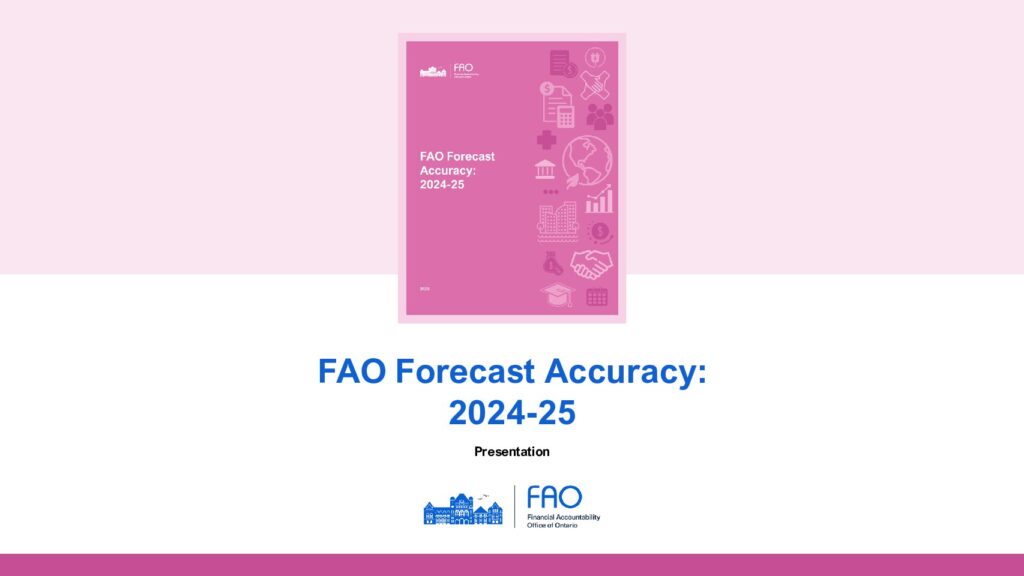 - February 19, 2026This report compares the FAO’s projections for the 2024-25 fiscal year for Ontario’s budget balance, revenue and spending against the actual results published in the Public Accounts of Ontario. The report also reviews the FAO’s historical forecast accuracy since 2016-17 and compares the FAO’s forecasts against the government’s forecasts in Ontario Budgets.