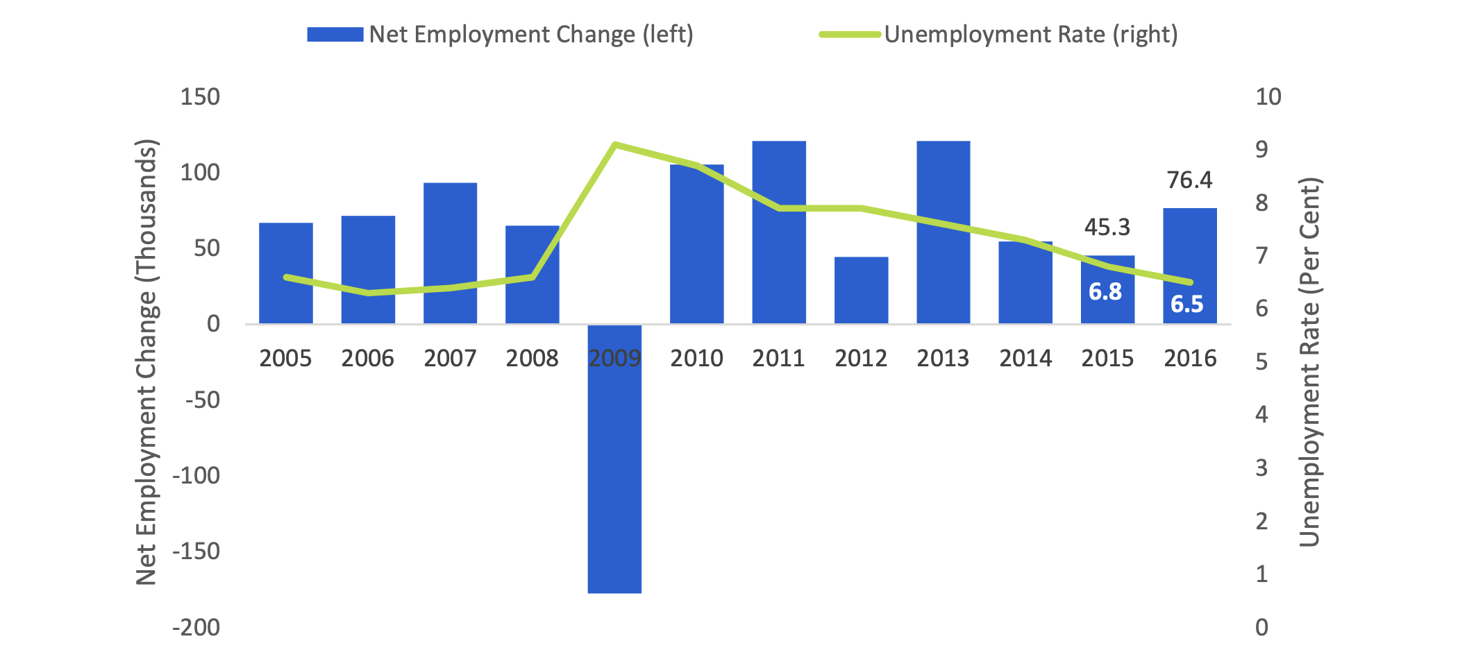 This graph shows Ontario’s net employment change and unemployment rate from 2005 to 2016. Employment grew in 2016 by +76,400 positions, compared to +45,300 positions in 2015. The graph shows the unemployment rate declining since 2009, falling from 9.1 per cent in 2009 to 6.5 per cent in 2016.