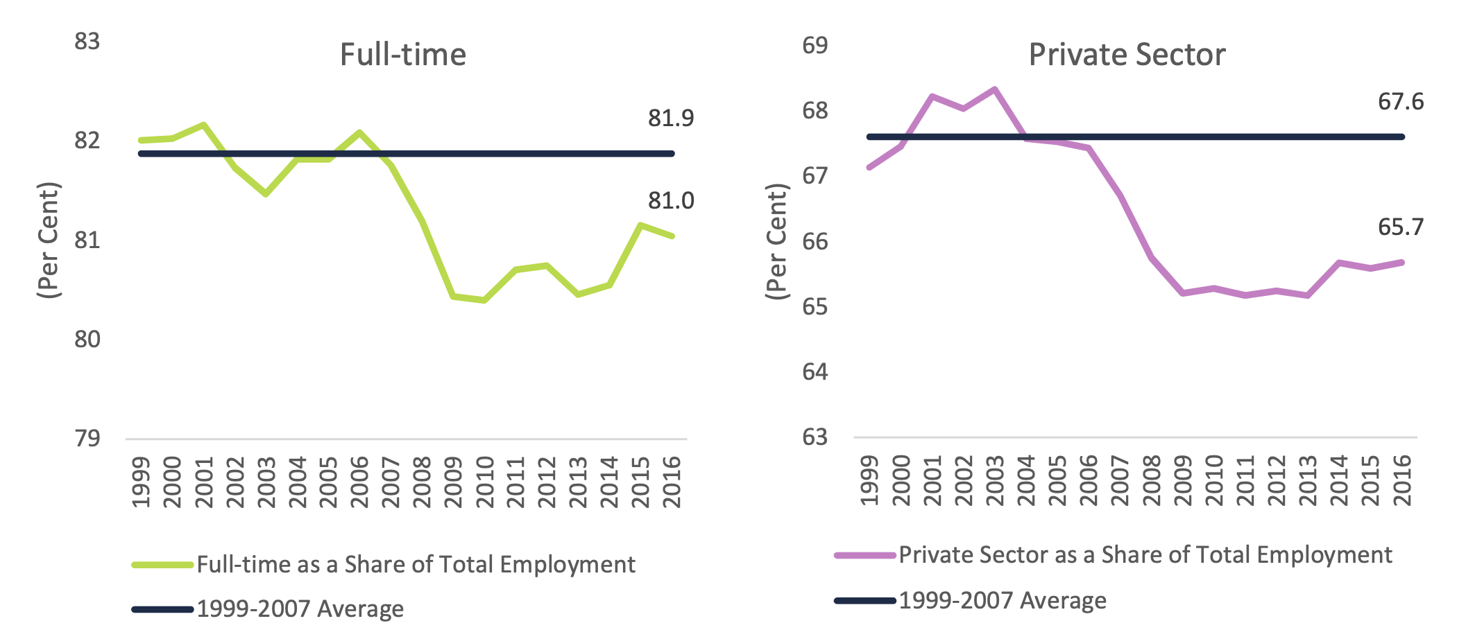 This figure shows two graphs. The first graph compares the share of full-time employment relative to total employment against its 1999-2007 average of 81.9 per cent. The graph shows a steep drop in the share of full-time positions from 2006 to 2009, falling from 82.1 per cent in 2006 to 80.4 per cent in 2009. After the drop, the share of full-time employment increased slightly, reaching 81.0 per cent in 2016. In 2016, the share was almost one percentage point below its 1999-2007 average.