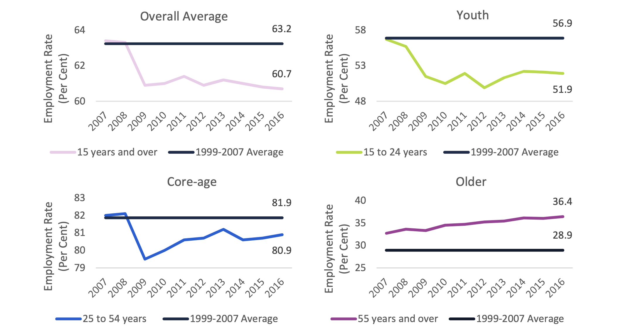 This figure shows four graphs, all of which compare a certain age group’s (15 years and over, 15 to 24 years, 25 to 54 years and 55 years and over) employment rate to their respective 1999-2007 employment rate average. The graphs each span the years 2007 to 2016.