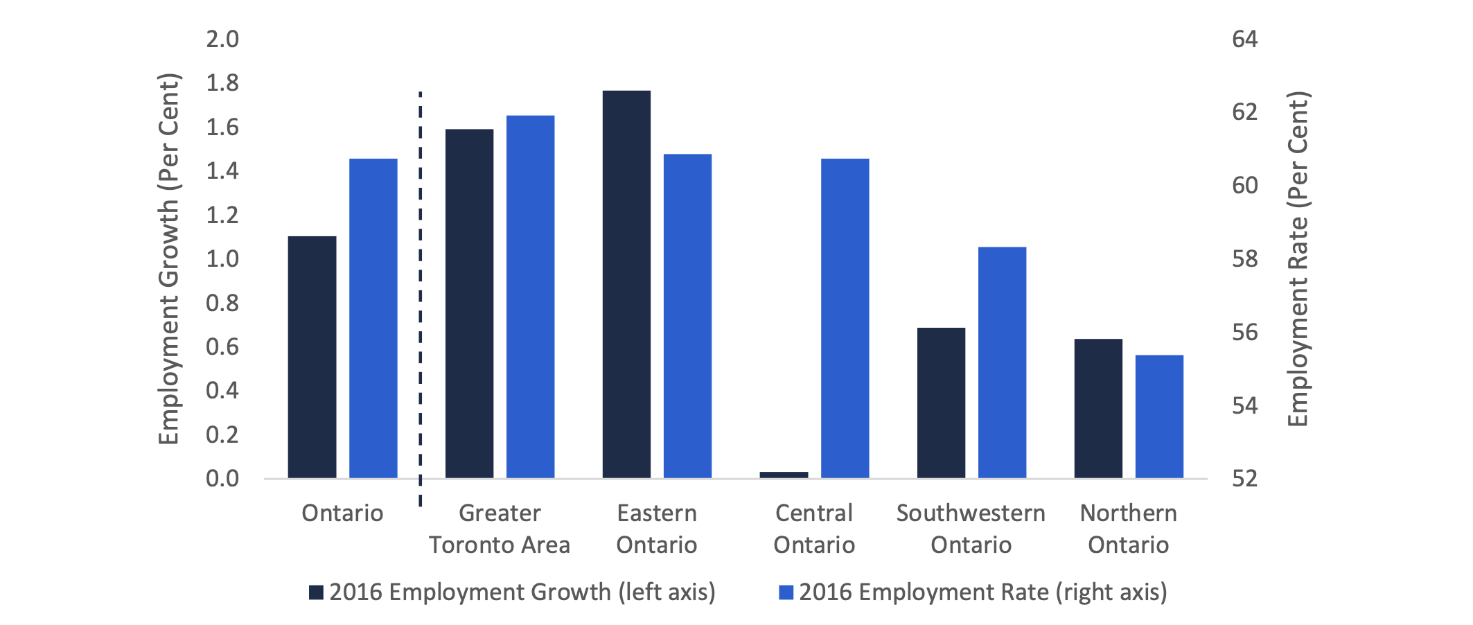 - Central Ontario employment increased by just 500 net new jobs in 2016, while the region’s employment rate slipped to 60.7 per cent.