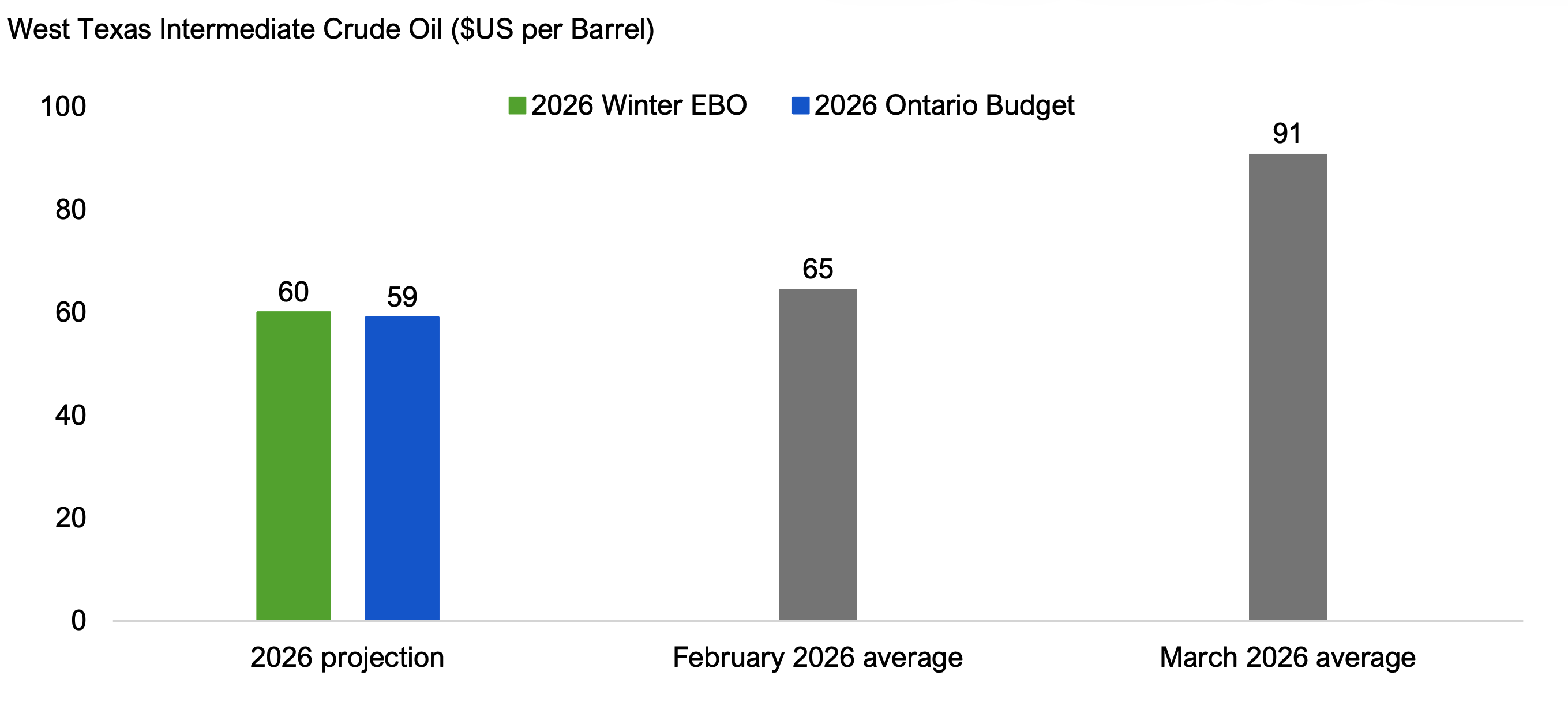 Since the release of the 2026 budget and the FAO’s Winter 2026 EBO, several significant downside risks have emerged. Recent data indicate that Ontario’s population growth and economic activity were weaker than anticipated in late 2025 and early 2026. Furthermore, the war in Iran has disrupted supply chains and raised oil prices dramatically, which will lift inflation and could slow household discretionary spending and business activity. Notably, the average price of West Texas Intermediate crude oil in March 2026 was $91 US per barrel, 41 per cent higher than the February 2026 average of $65 US. According to the 2025 Ontario Budget, a sustained increase in crude oil prices of $10 US per barrel would lower Ontario real GDP growth in 2026 by 0.1 to 0.3 percentage points.[4] Consequently, if oil prices remain elevated, Ontario’s GDP growth in 2026 could be significantly weaker than projected by both the government and the FAO.