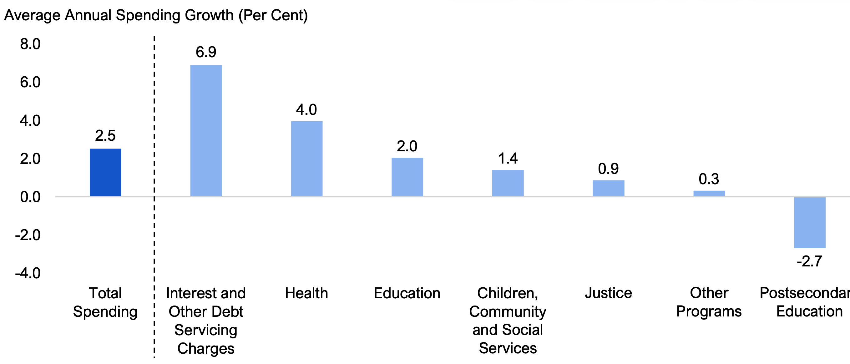 Over the 2024-25 to 2028-29 period, the average annual growth for interest and other debt servicing charges (6.9 per cent) and for the health sector (4.0 per cent), is expected to be faster than the average annual growth rate for total spending (2.5 per cent). All other sectors are projected to grow more slowly than total spending, including education (2.0 per cent),[15] children, community and social services (1.4 per cent), justice (0.9 per cent) and ‘other programs’ (0.3 per cent). Postsecondary education spending is projected to decline at an average annual rate of 2.7 per cent.