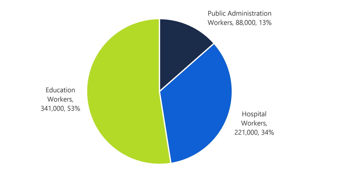 This is a pie chart representing the total share of Education, Hospital, and Public Administration workers in Ontario’s public sector. Education workers make up 53% of Ontario’s public sector, the largest of all three groups. Public administration workers represent the smallest share of 13%, while Hospital workers make up the remaining 34%.