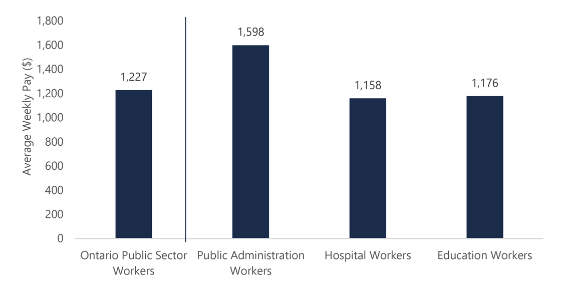 The average earnings for Ontario public sector workers is estimated to be $1,227 per week in 2018,[5] or roughly $63,800 annually. Among public sector workers, Ontario public administration employees have the highest average weekly pay at $1,598 per week, followed by hospital and education workers, at $1,158 and $1,176 per week, respectively.