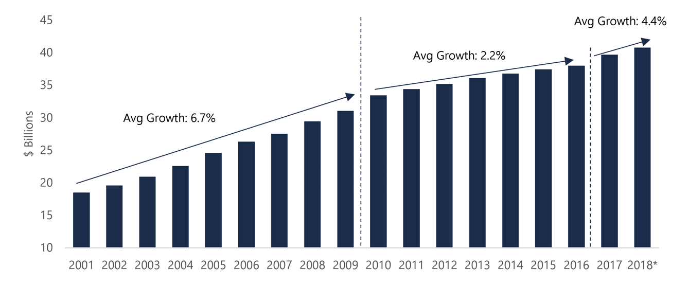 This graph shows the average growth in compensation expense for public sector employees in Ontario across three time periods: 2001 to 2009, 2010 to 2016, and 2017 to 2018. Between 2001 and 2009, the average growth in compensation expense was 6.7%. From 2010 to 2016, average growth in compensation expense slowed dramatically to 2.2%, and increased to 4.4% between 2017 and 2018.