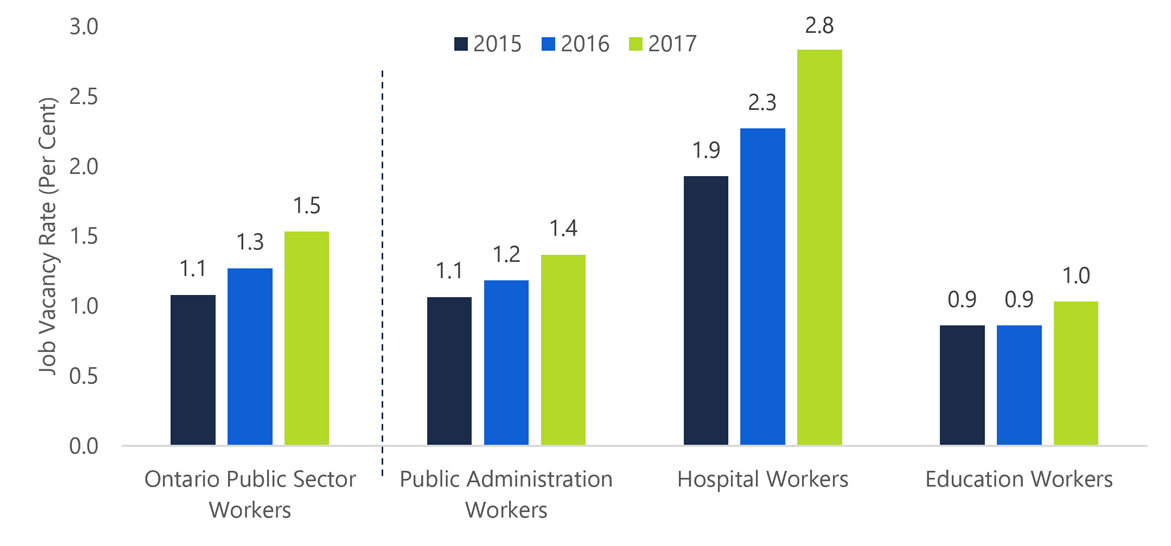 Reflecting Ontario’s increasingly competitive labour market, job vacancy rates (the ratio of job postings to total employment) have also been rising. In the public sector, the job vacancy rate increased from 1.1 per cent in 2015 to 1.5 per cent in 2017. However, within the public sector, the vacancy rate for hospital jobs has increased more dramatically, rising from 1.9 per cent in 2015 to 2.8 per cent in 2017, suggesting that hospitals may be experiencing increasing difficulty hiring new workers.