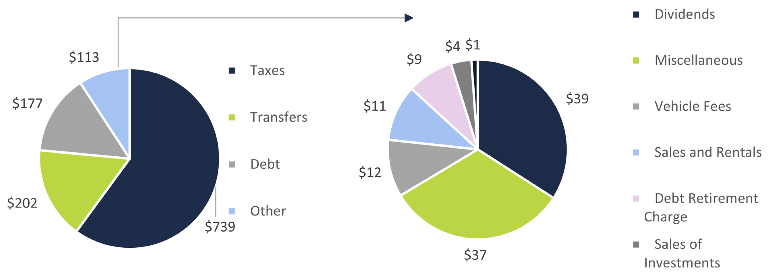 This figure shows the FAO’s estimate of the different sources of cash included in the other category. This figure shows that the most significant source of cash in this category is dividends received from government business enterprises (GBEs) ($39 billion). This figure shows that other sources of cash in this category include vehicle and driver registration fees ($12 billion) and the electricity sector debt retirement charge ($9 billion), among others.