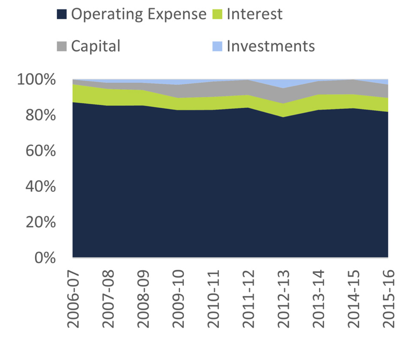 Figure 4 shows the FAO’s estimate of how the composition of Provincial cash sources has changed over the past 10 fiscal years. A greater portion of cash was sourced from issuing debt from 2006-07 to 2009-10. Since then, cash has been sourced more from taxes and less from debt. Within the $113 billion of “Other” cash sources, the miscellaneous category[15] had the most significant change, contributing about 43 per cent in 2006-07 but only 25 per cent in 2015-16. The contribution of dividends from GBEs increased by eight per cent over the period. Also within the Other category (Figure 4), the contribution from sales of investments increased in recent years, reflecting the Province’s sale of its shares in General Motors and Hydro One. Finally, within the Other category, the contribution of the electricity sector debt retirement charge will disappear with its elimination on April 1, 2018.[16] Figure 5 shows the FAO’s estimate of how Provincial cash use has changed over the past 10 fiscal years. The contribution of operating expenses declined by four per cent over the period, while the contribution of capital spending increased by four per cent. In dollar terms, capital spending rose from $2.5 billion in 2006-07 to $11 billion in 2015-16.