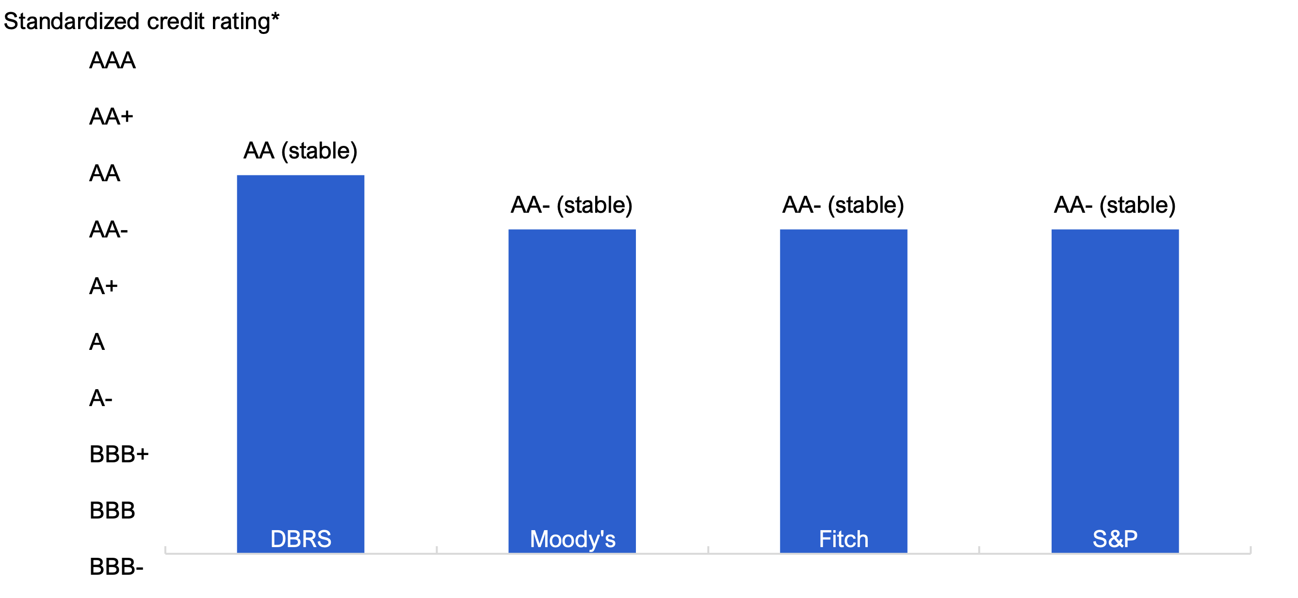| Alberta | AA- (stable) | AA (stable) | Aa2 (stable) | AA (stable) | 3.25 |