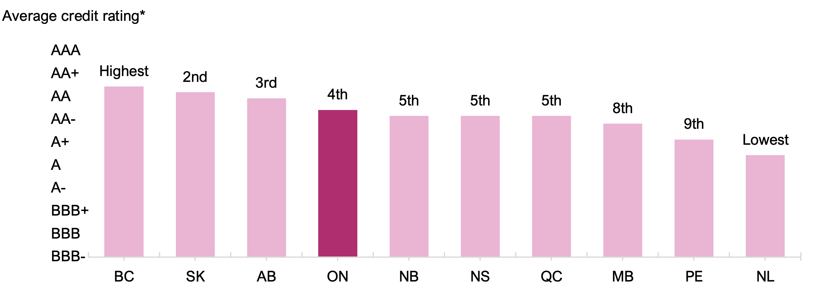 - Ontario’s average credit rating was the fourth highest among the provinces, behind British Columbia, Saskatchewan and Alberta, an improvement from the fifth highest credit rating a year earlier.