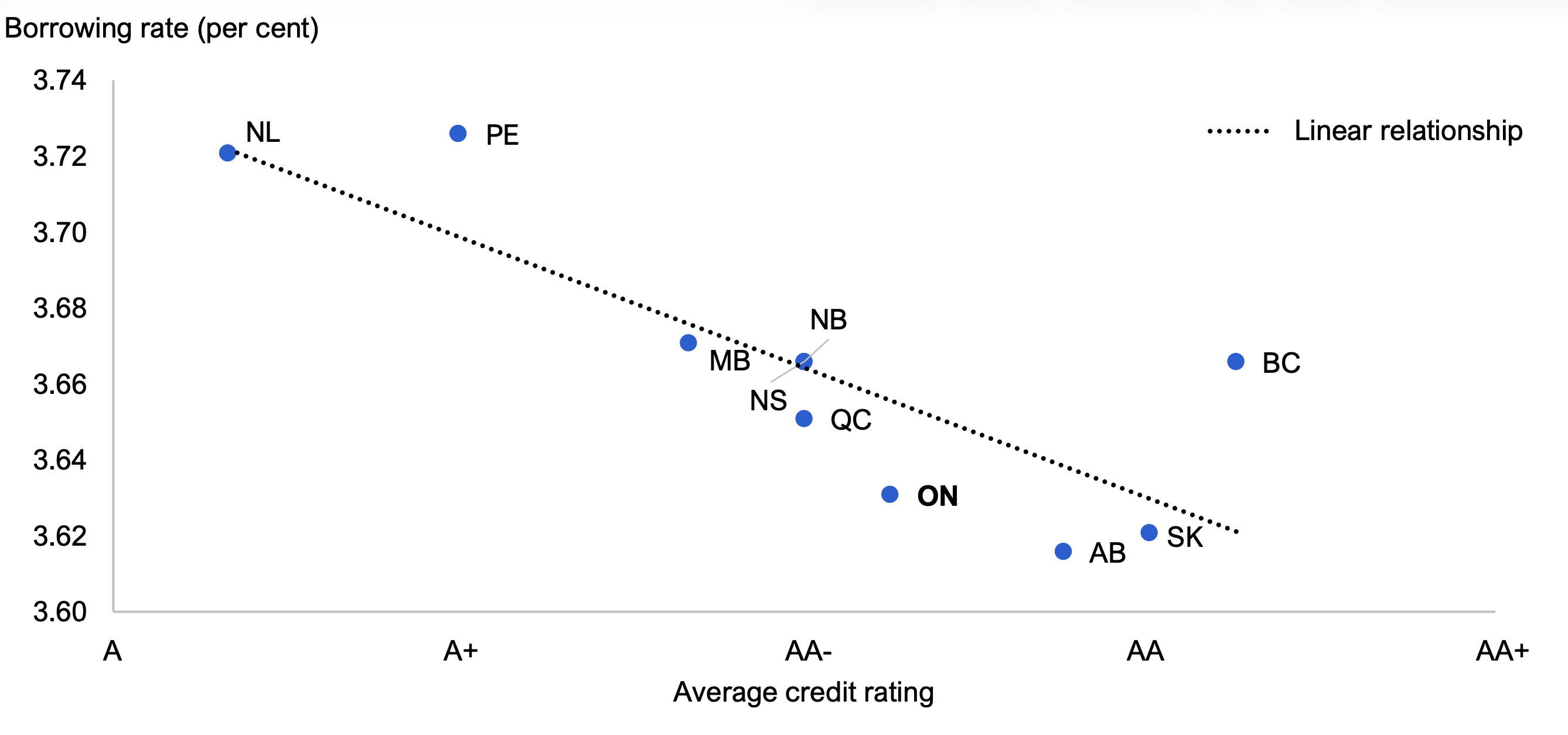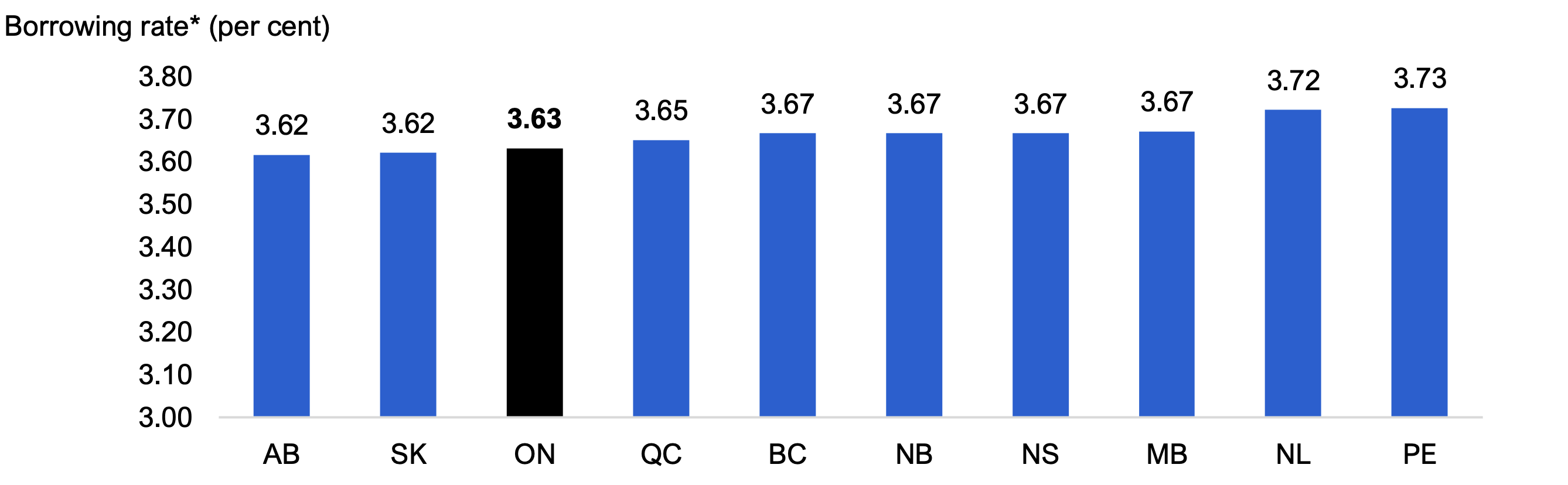 - As of October 16, 2025, Ontario had the third lowest borrowing rate among the provinces, behind Alberta and Saskatchewan. In the FAO’s last credit rating report, released in October 2024, Ontario had the lowest borrowing rate among the provinces, tied with Alberta.