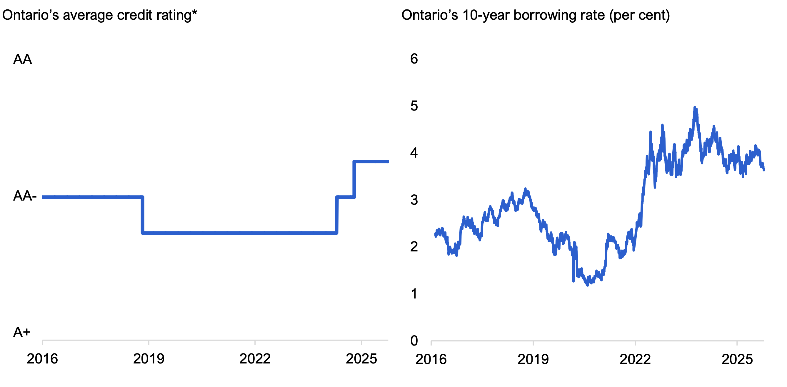 Note: Ontario’s average credit rating from February 16, 2016 to November 18, 2025; Ontario’s 10-year borrowing rate from February 16, 2016 to October 16, 2025.