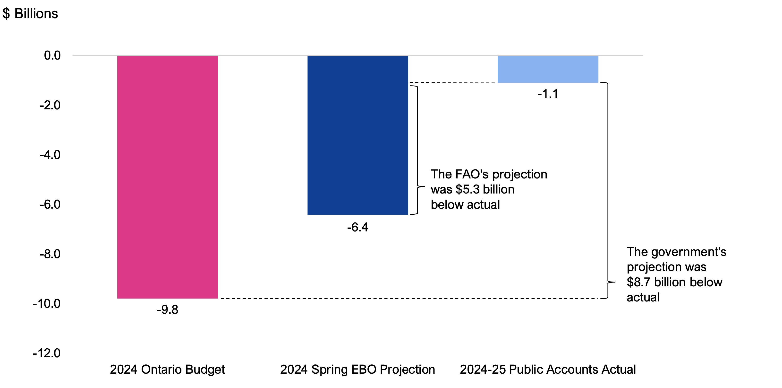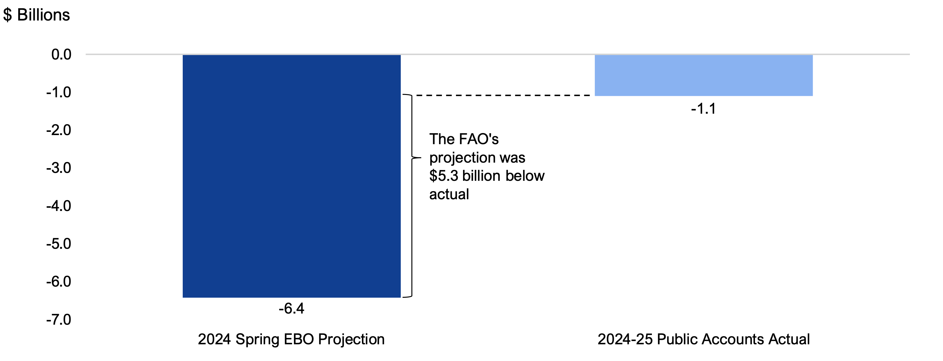 In the Spring 2024 EBO, the FAO projected a $6.4 billion budget deficit for 2024-25, which was $5.3 billion below the $1.1 billion actual budget deficit reported in the 2024-25 Public Accounts of Ontario.