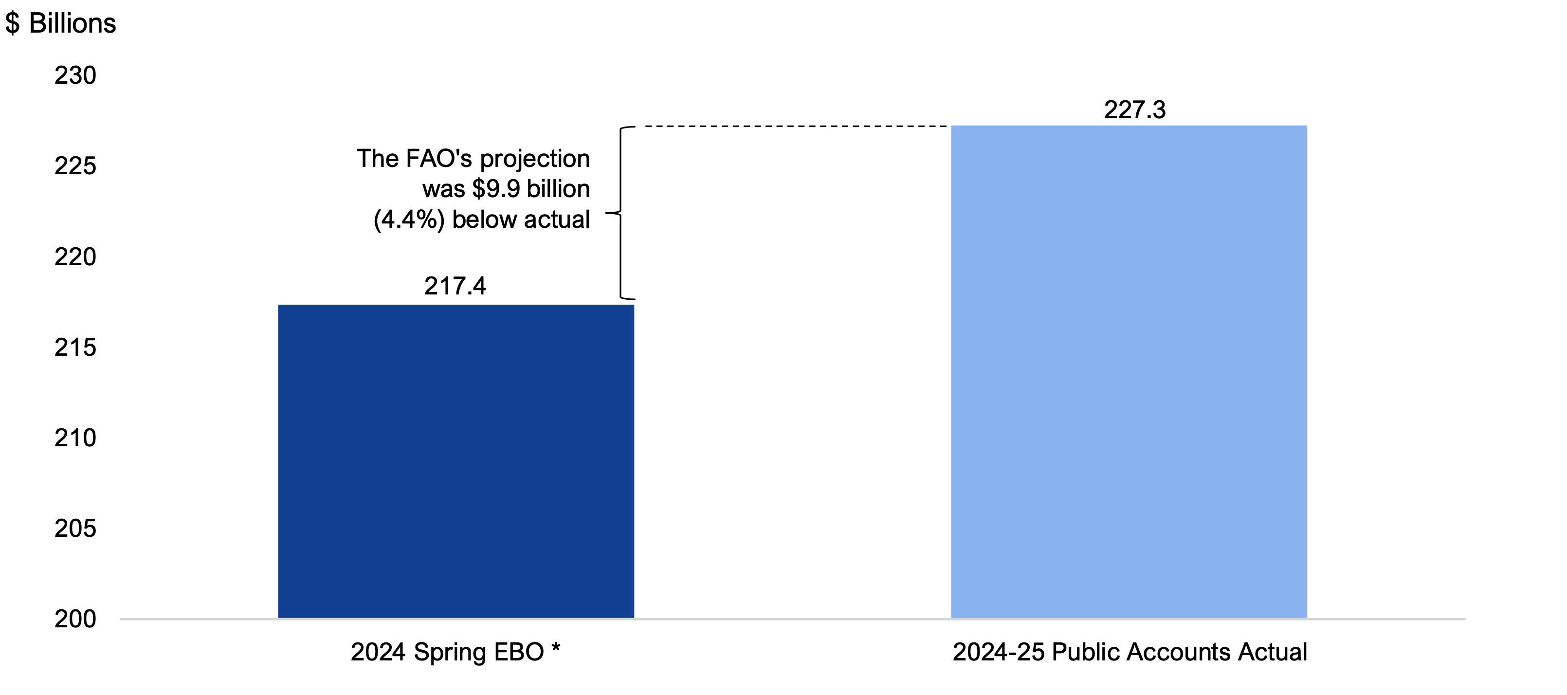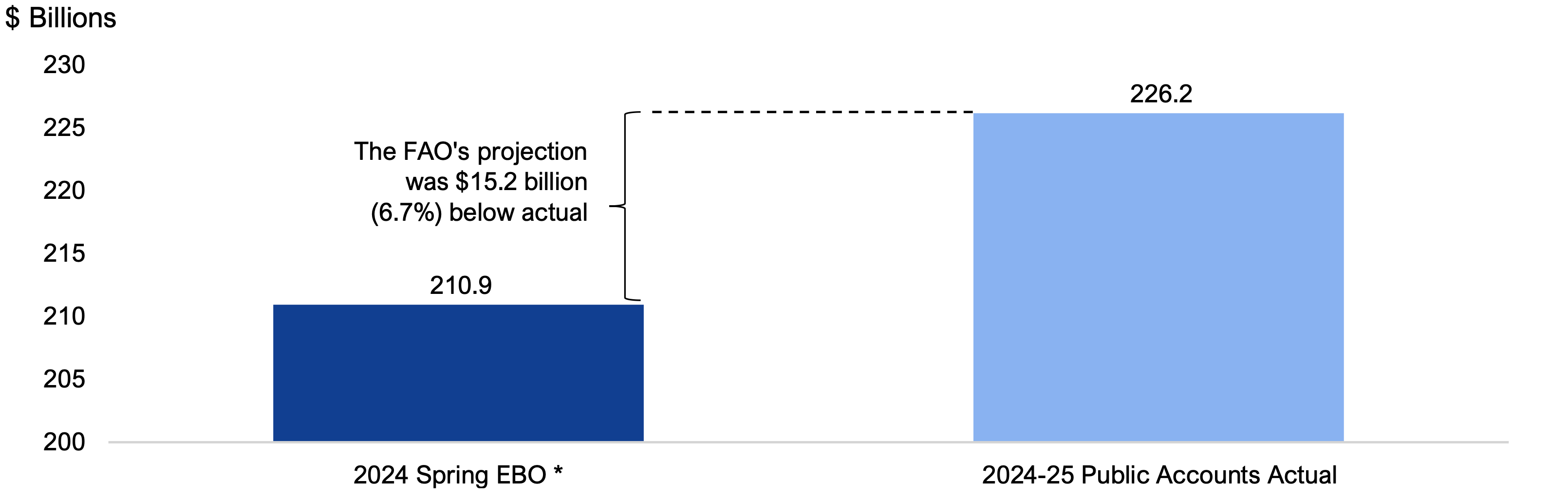 In the Spring 2024 EBO, the FAO projected total 2024-25 revenue at $210.9 billion,[2] which was $15.2 billion (6.7 per cent) below actual total revenue of $226.2 billion.
