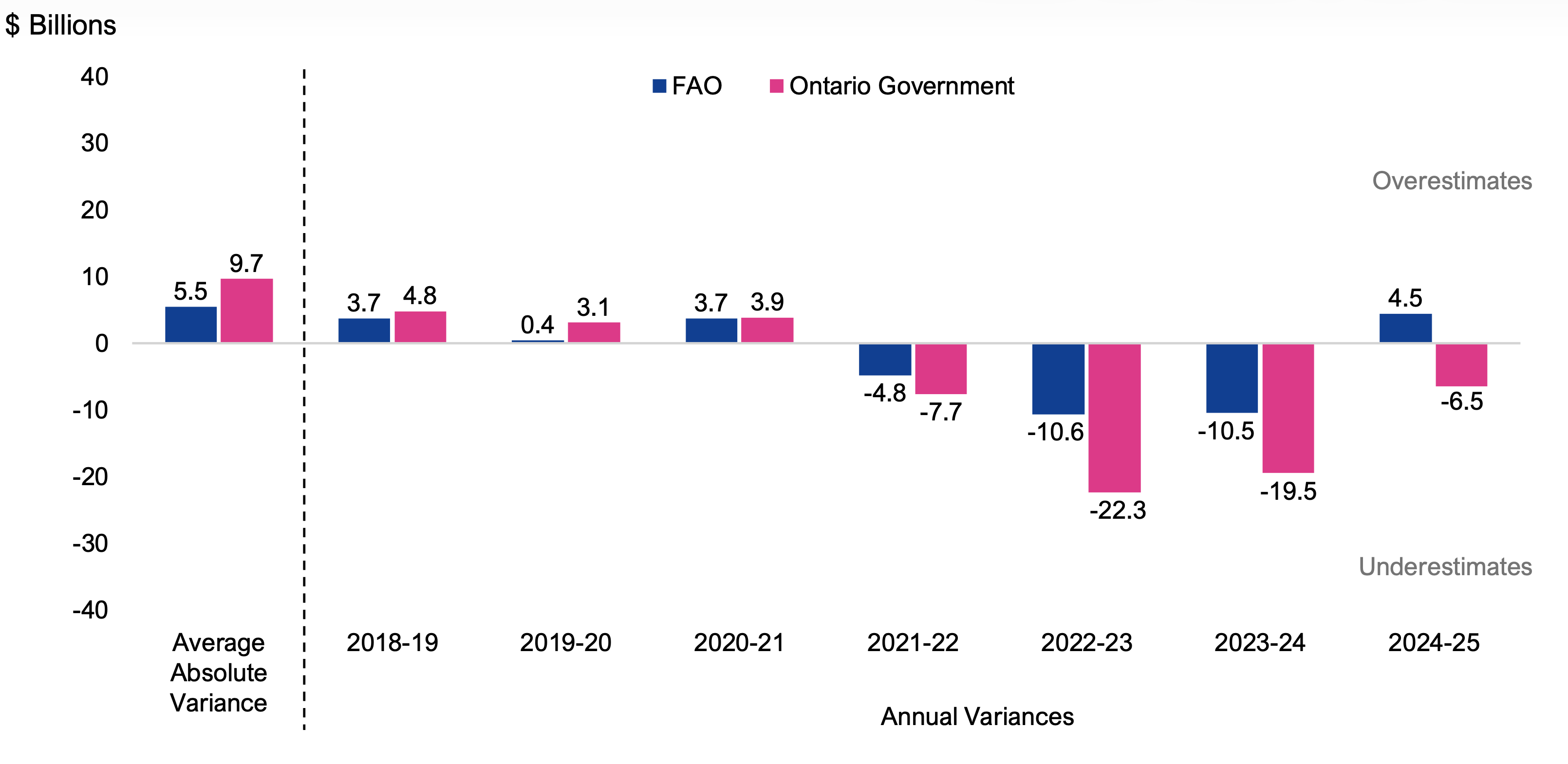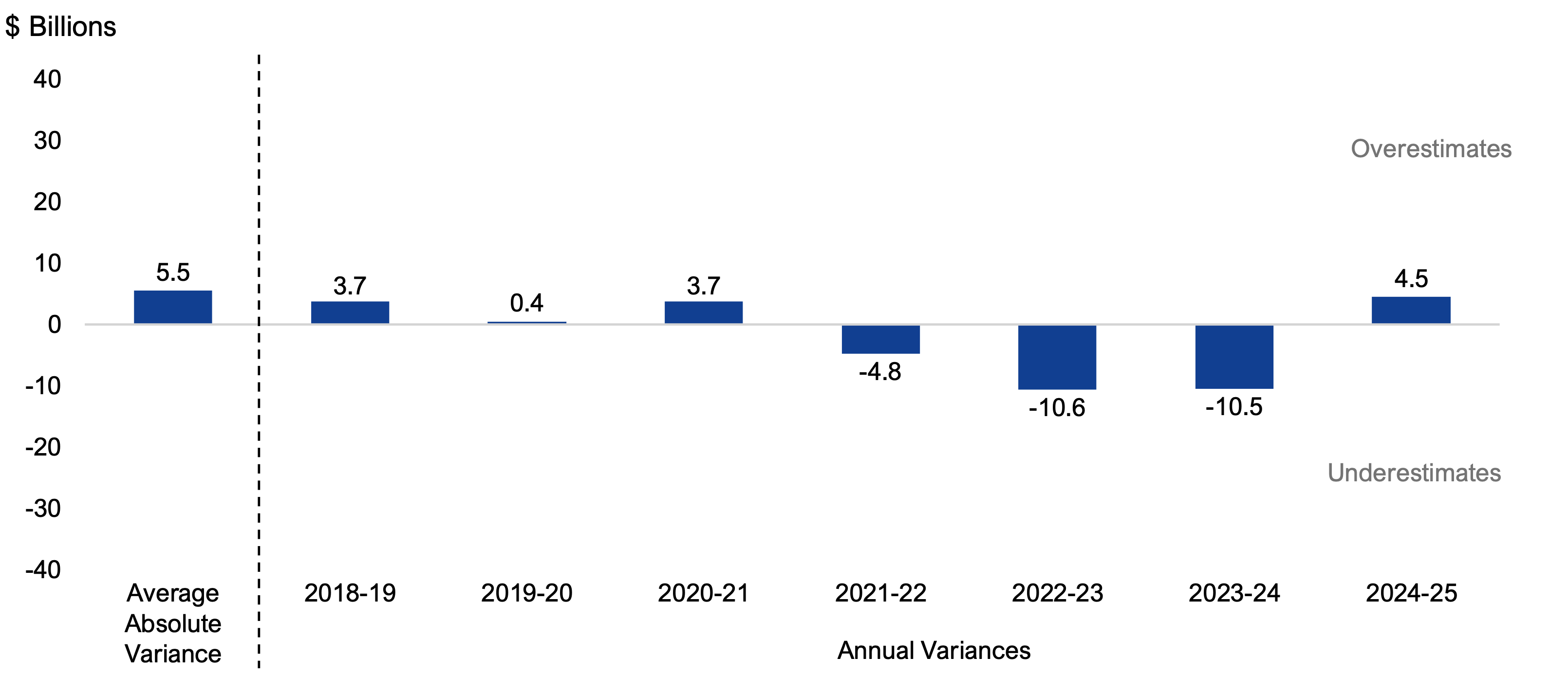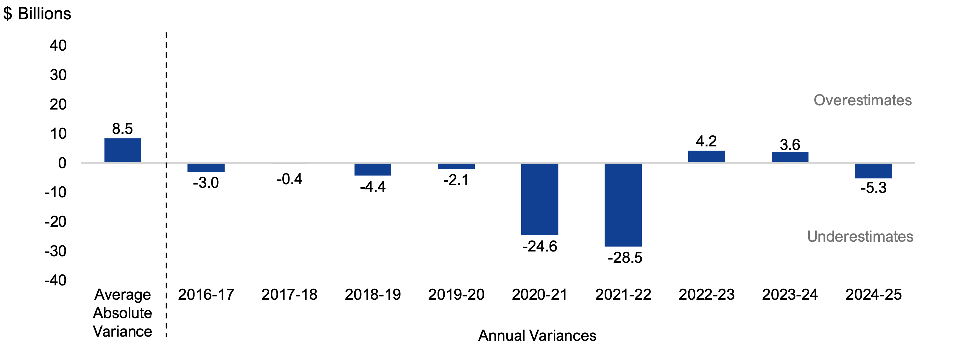 - From 2016-17 to 2024-25, the FAO’s one-year average absolute variance for the budget balance was $8.5 billion, while the government’s average absolute variance was $10.0 billion. By fiscal year, the government’s projection was closer to the actual results in the Public Accounts in five of nine years.