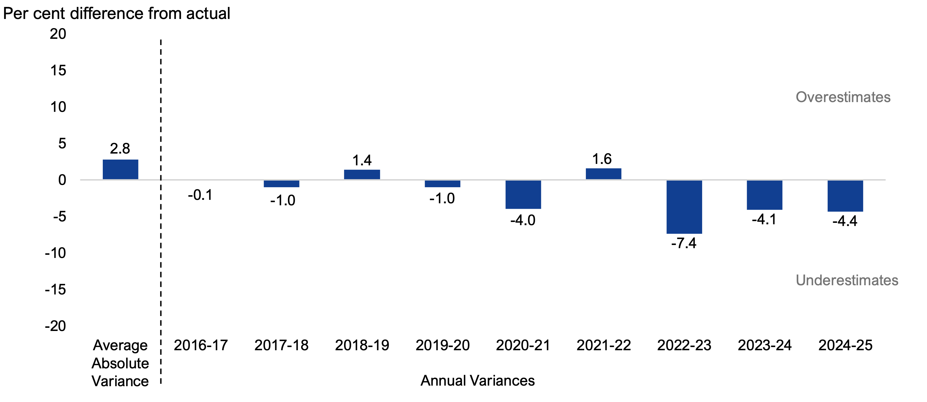 - Over the last three years, from 2022-23 to 2024-25, budget balance variances for both the FAO and the government were reduced. The FAO’s average absolute variance was $4.4 billion, while the government’s was $7.8 billion.