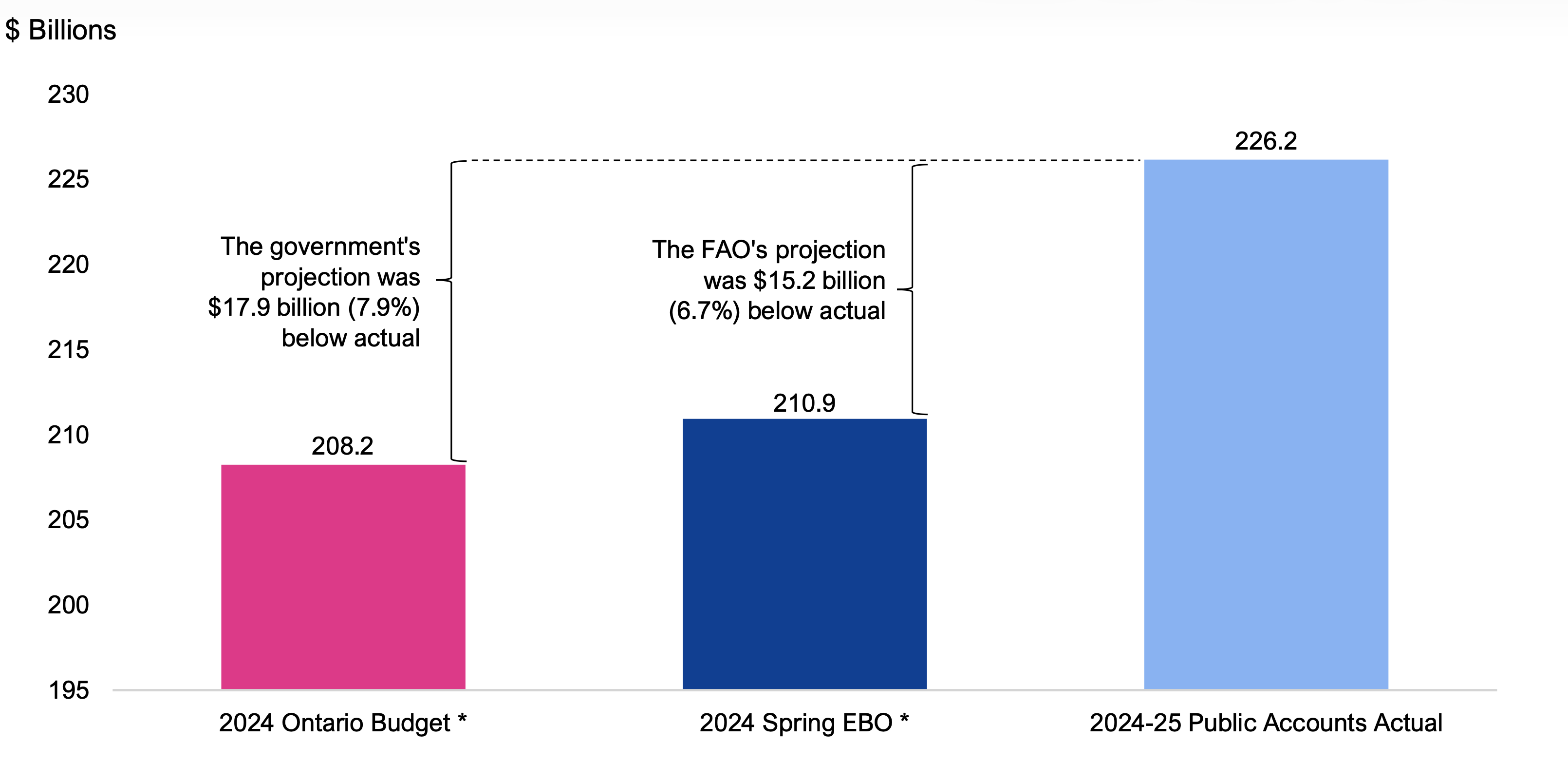 - In the Spring 2024 Economic and Budget Outlook (EBO), released on May 15, 2024, the FAO projected a $6.4 billion budget deficit for 2024-25, which was $5.3 billion below the $1.1 billion actual budget deficit reported in the 2024-25 Public Accounts of Ontario, released on September 26, 2025.