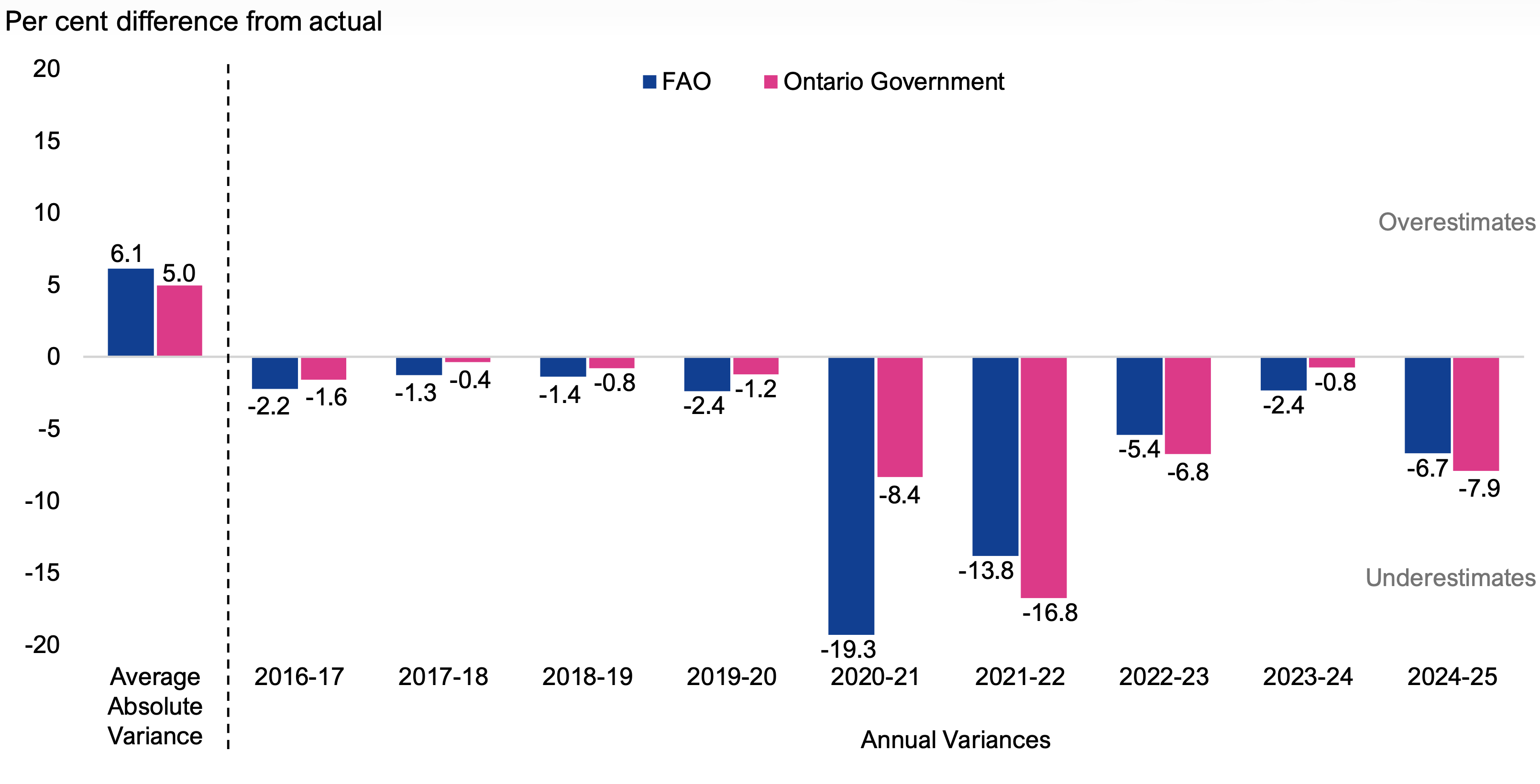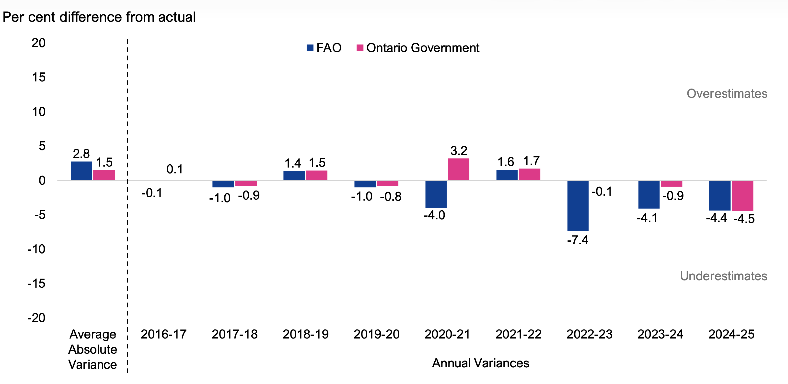 [7] For example, the forecast variance for 2024-25 is calculated as the difference between the FAO’s forecast for 2024-25, published on May 15, 2024 in the Spring 2024 Economic and Budget Outlook, and the actual results released in the 2024-25 Public Accounts of Ontario, published on September 26, 2025.