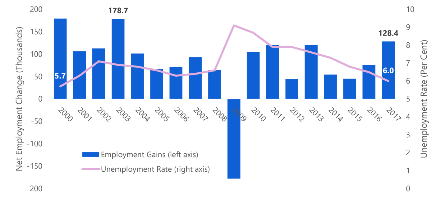 This graph shows Ontario’s net employment change and unemployment rate from 2000 to 2017. Employment grew in 2017 by +128,400 positions, the largest increase in jobs since 2003. The graph shows the unemployment rate declining since 2009, falling from 9.1 per cent in 2009 to 6.0 per cent in 2017.