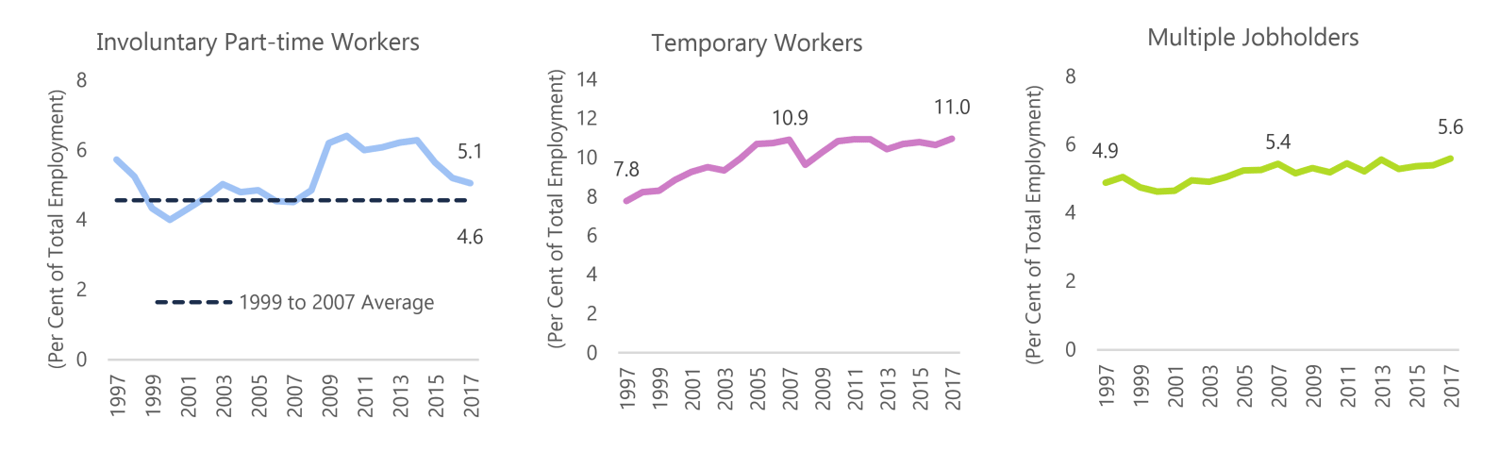 - Non-standard forms of employment – sometimes referred to as ‘precarious work’ – have become more common. The share of temporary workers and multiple job holders (relative to total employment) increased in 2017, continuing a rising trend since the late 1990s. The share of involuntary part-time workers (another common measure of precarious work) has declined since the recession, but remains above its pre-recession average.