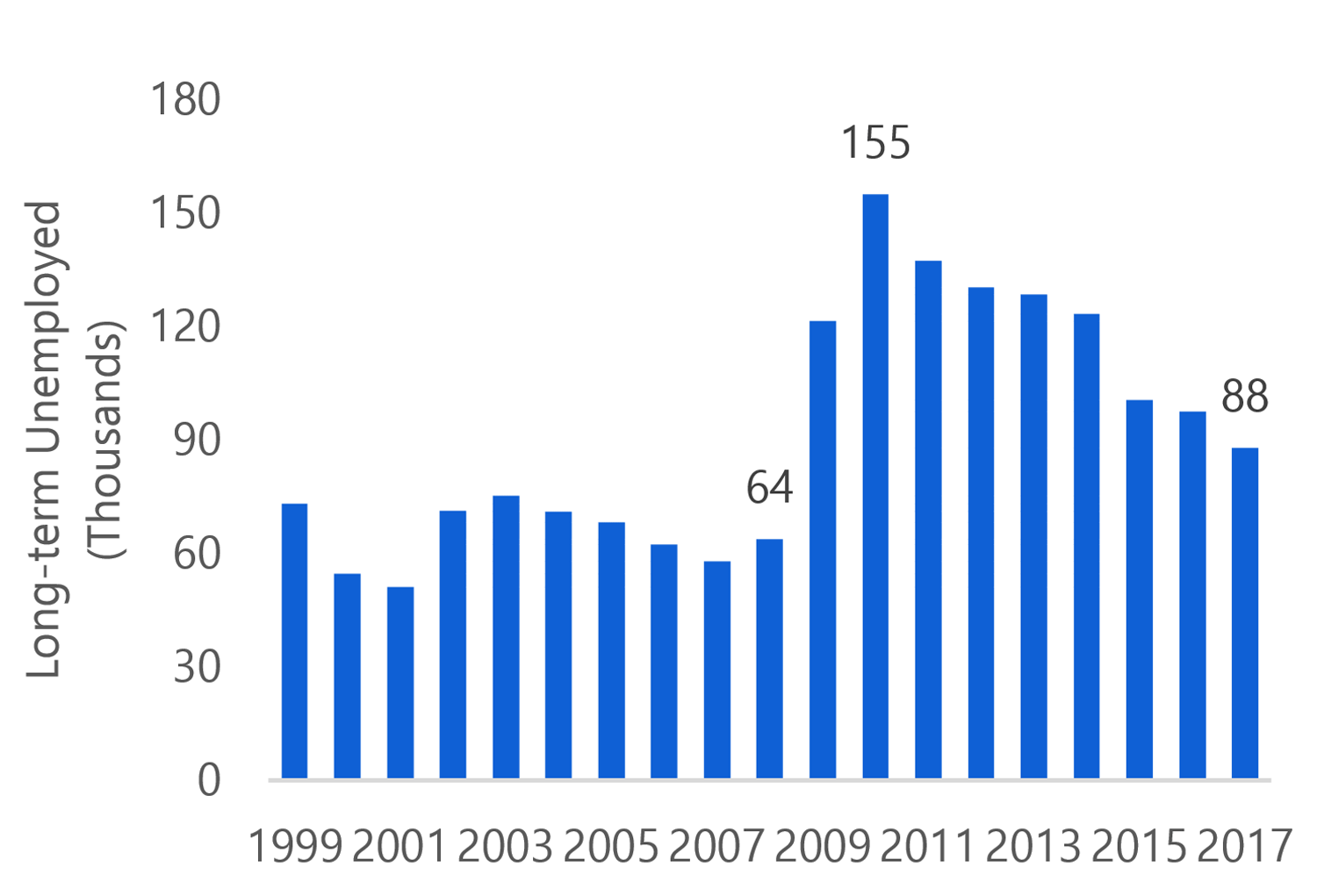 This chart shows the level of long-term unemployed in thousands from 1999 to 2017. The level was relatively steady from 1999 to 2007. During the recession the share increased rapidly, growing from 64 thousand people in 2007 to 155 thousand people in 2010. The number of long-term unemployed has since declined, reaching 88 thousand people in 2017, although it still remains above pre-recession levels.