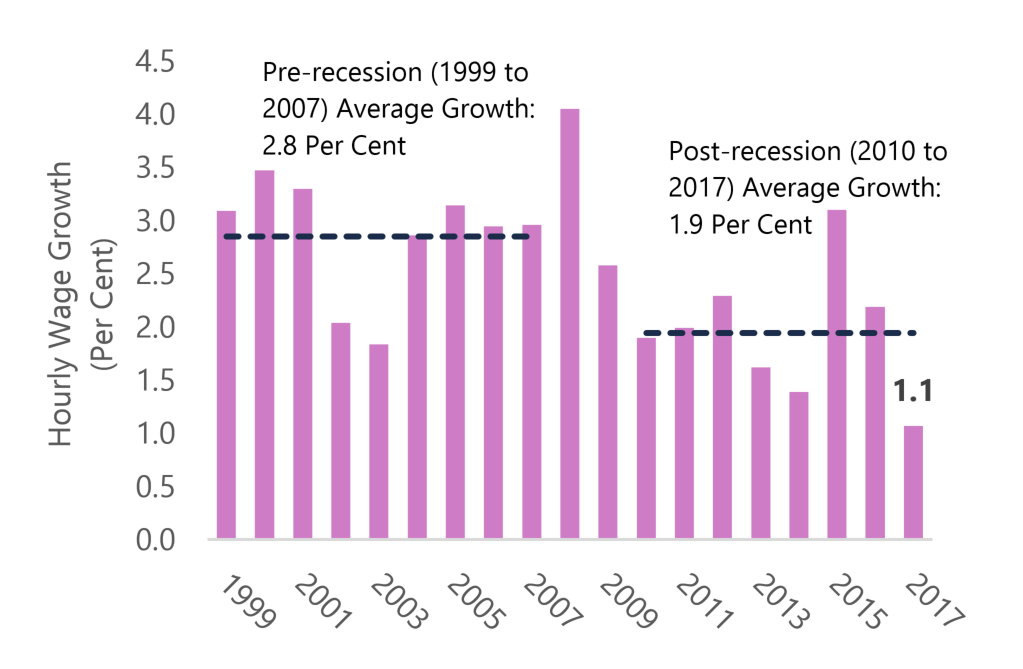 This chart shows average annual hourly wage growth 1999 to 2017. Pre-recession average annual wage growth was 2.8 per cent from 1999 to 2007. Following the recession, wage growth averaged 1.9 per cent from 2010 to 2017. In 2017, wage growth was 1.1 per cent, the weakest wage growth since 1998.