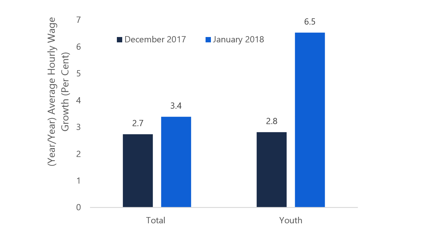 This chart shows the December 2017 and January 2018 year-over-year growth in average hourly wages for both total average hourly wages and youth average hourly wages. The chart shows that total year-over-year hourly wages increased from 2.7 per cent in December 2017 to 3.4 per cent in January 2018. Youth year-over-year hourly wages increased from 2.8 per cent in December 2017 to 6.5 per cent in January 2018.