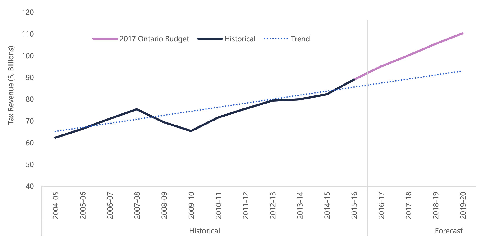 This chart shows three lines, representing tax revenue in billions of dollars for the period of 2000-01 to 2019-20. The first line shows the historical tax revenue from 2000-01 to 2015-16. The second shows the government’s forecasted tax revenue from the 2017 Ontario Budget for the period of 2016-17 to 2019-20. The final line shows the linear trend in tax revenue from 2000-01 to 2015-16 and extends that trend to 2019-20. The chart shows that the government’s forecast is much higher over the forecast period than the trend in tax revenue since 2000-01.