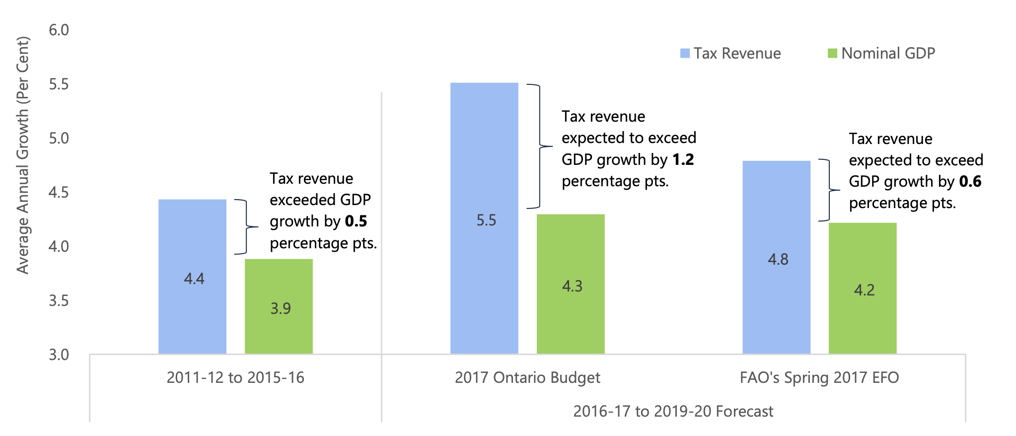 In contrast, in the Spring 2017 Economic Fiscal Outlook (EFO), the FAO is forecasting tax revenue growth of 4.8 per cent on average over the next four years, 0.6 percentage points faster than nominal GDP growth. Importantly, the stronger tax revenue growth projected in the 2017 Budget results in an additional $3.0 billion in tax revenues by 2019-20, relative to the FAO projection.