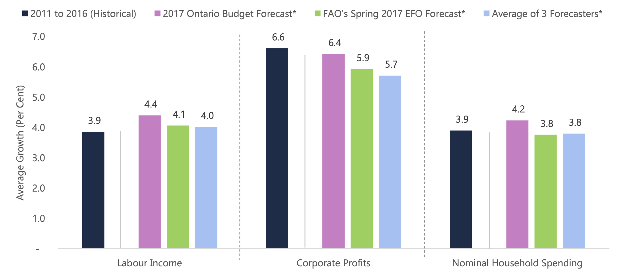 The chart shows that for corporate profits – all three forecasters are expecting growth lower than the historical average of 6.6 per cent. The Budget is projecting growth of 6.4 per cent, while the FAO and three independent forecasters are projecting growth of 5.9 and 5.7 per cent, respectively.