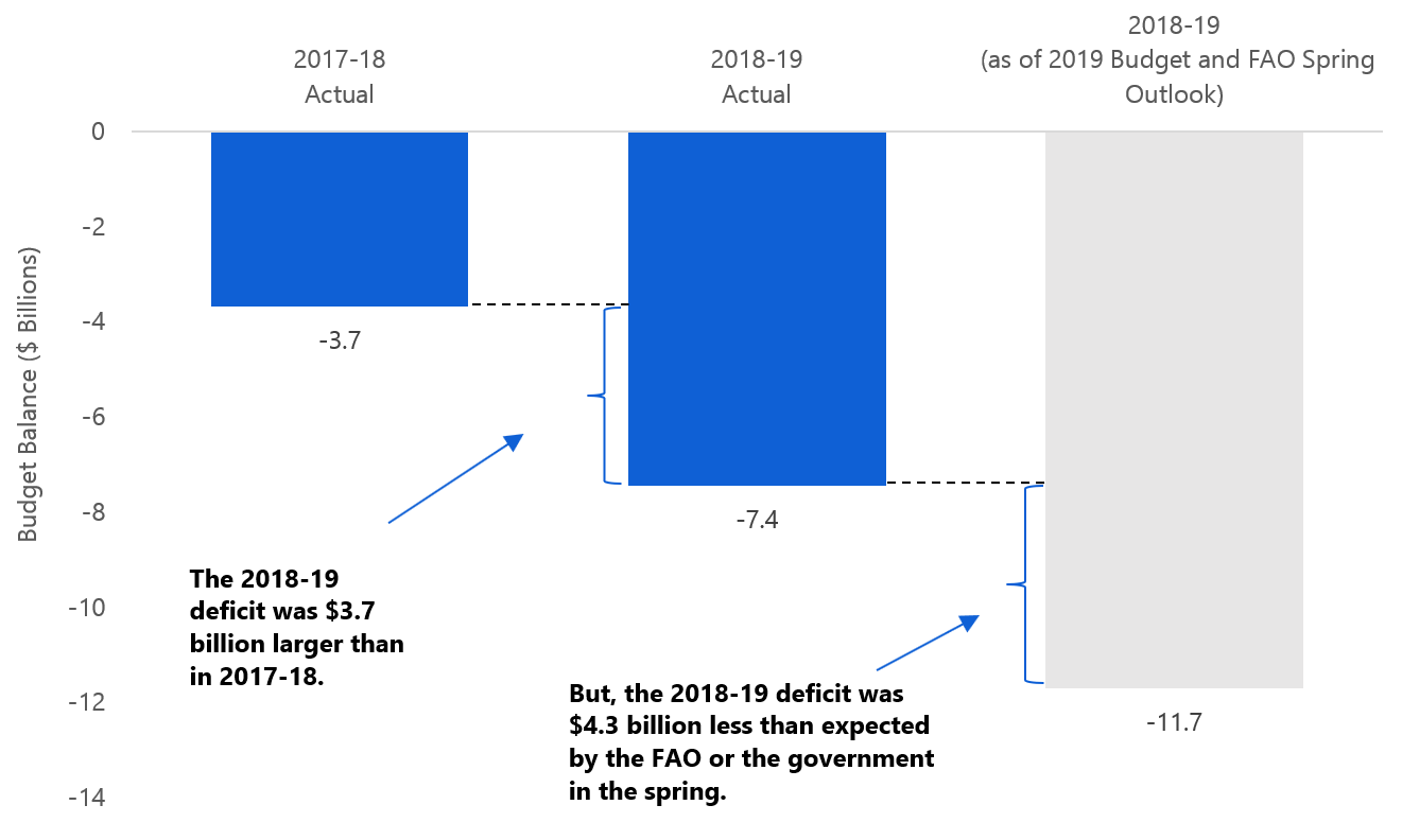 The note also looks at the unusually large $4.3 billion improvement in the actual 2018-19 deficit from the 2019 budget projection,[1] which was largely the result of unexpectedly strong revenues.