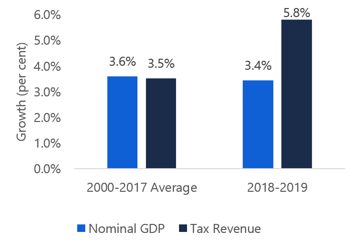 This chart shows the average annual growth in nominal GDP and tax revenue from 2000 to 2017 and the growth in nominal GDP and tax revenue in 2018-19. Between 2000 and 2017, the nominal GDP grew by 3.6 per cent per year while tax revenue grew by 3.5 per cent per year. In 2018-19, nominal GDP grew by 3.4 per cent while tax revenue grew by 5.8 per cent.