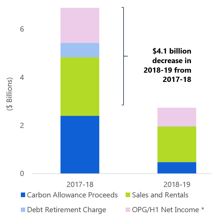 In July 2018, the Province ended the cap and trade program, which raised revenue through the auction of emissions allowances to fund spending on greenhouse gas reduction initiatives. The end of the cap and trade program led to a $1.9 billion decline in 2018-19 revenues compared to 2017-18.[3]