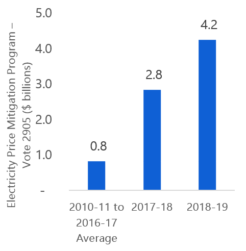 This chart shows the average cost of the Electricity Price Mitigation Program (Vote 2905) from 2010-11 to 2016-17, and the cost of the program in both 2017-18 and 2018-19. The chart shows that the cost of the program was $0.8 billion on average from 2010-11 to 2016-17, $2.8 billion in 2017-18, and $4.2 billion in 2018-19.