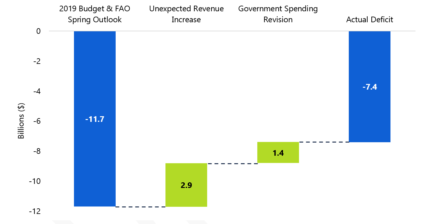 With the release of the Public Accounts showing a deficit of $7.4 billion in 2018-19, the government has significantly overachieved on the 2019 budget’s projection of an $11.7 billion deficit, largely as a result of unexpectedly high revenues. However, the extent to which this overachievement will carry-forward to future years is uncertain.