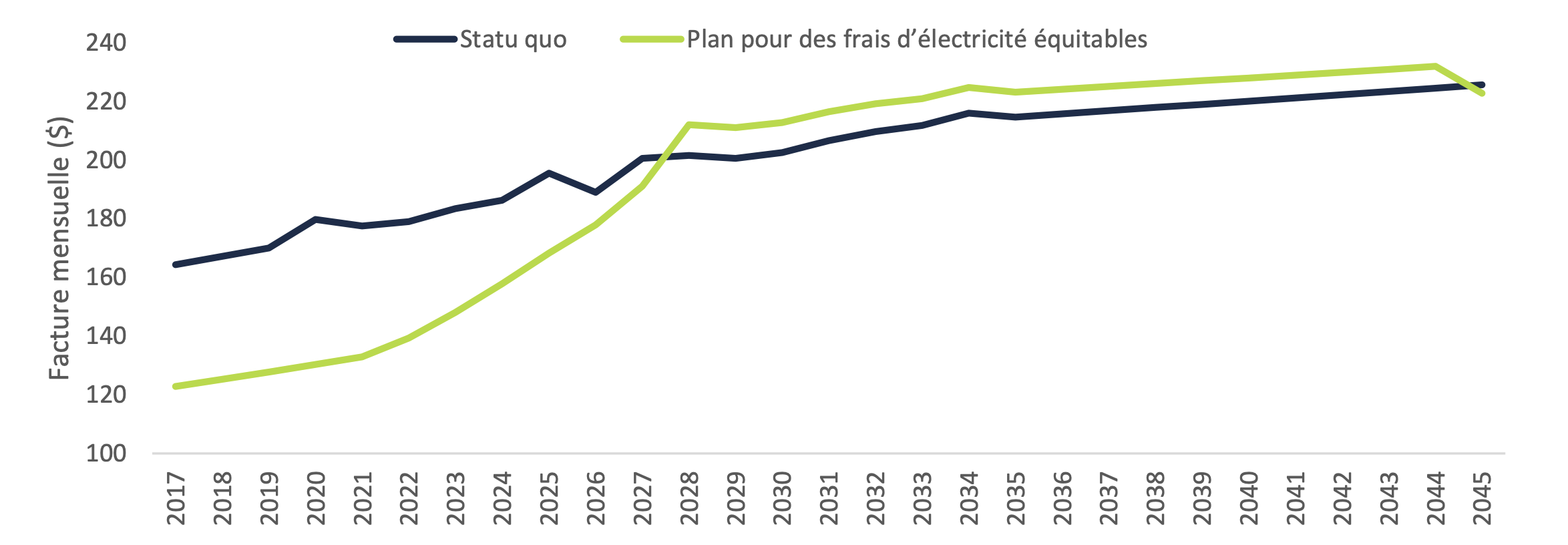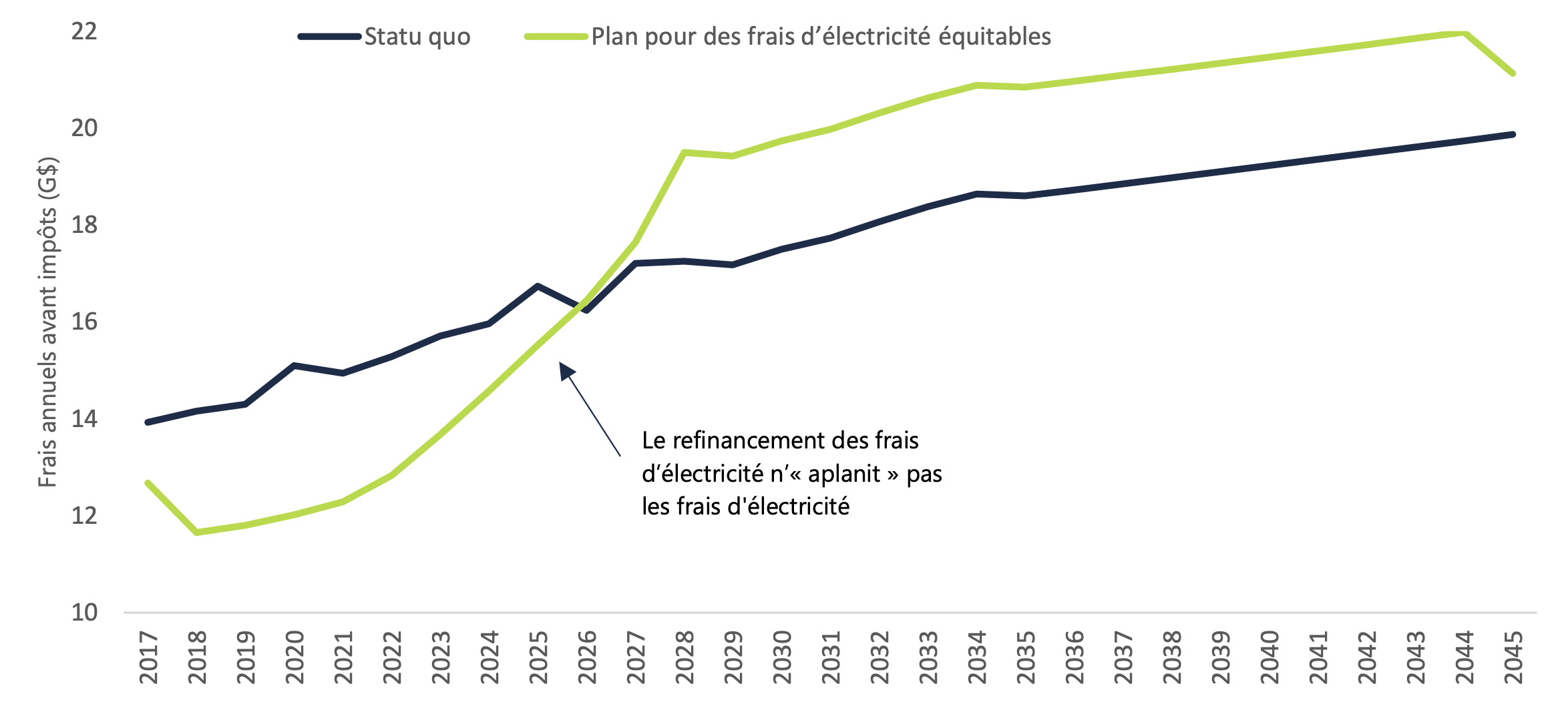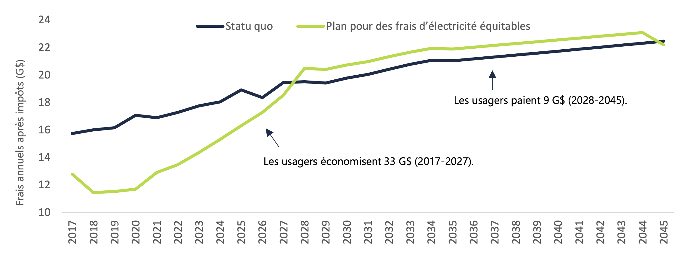 Bien que les consommateurs d’électricité admissibles devraient réaliser des économies qui totaliseront en tout 24 G$ selon les projections, celles-ci ne seront pas réparties uniformément dans le temps. De 2017 à 2027, les frais d’électricité s’annoncent plus bas sous l’effet du Plan pour des frais d’électricité équitables qu’en cas de maintien du statu quo (une économie totale de 33 G$), mais après 2027, ils deviendront à l’inverse plus élevés (coût total de 9 G$). Il en résulte des économies nettes de 24 G$ sur 29 ans.