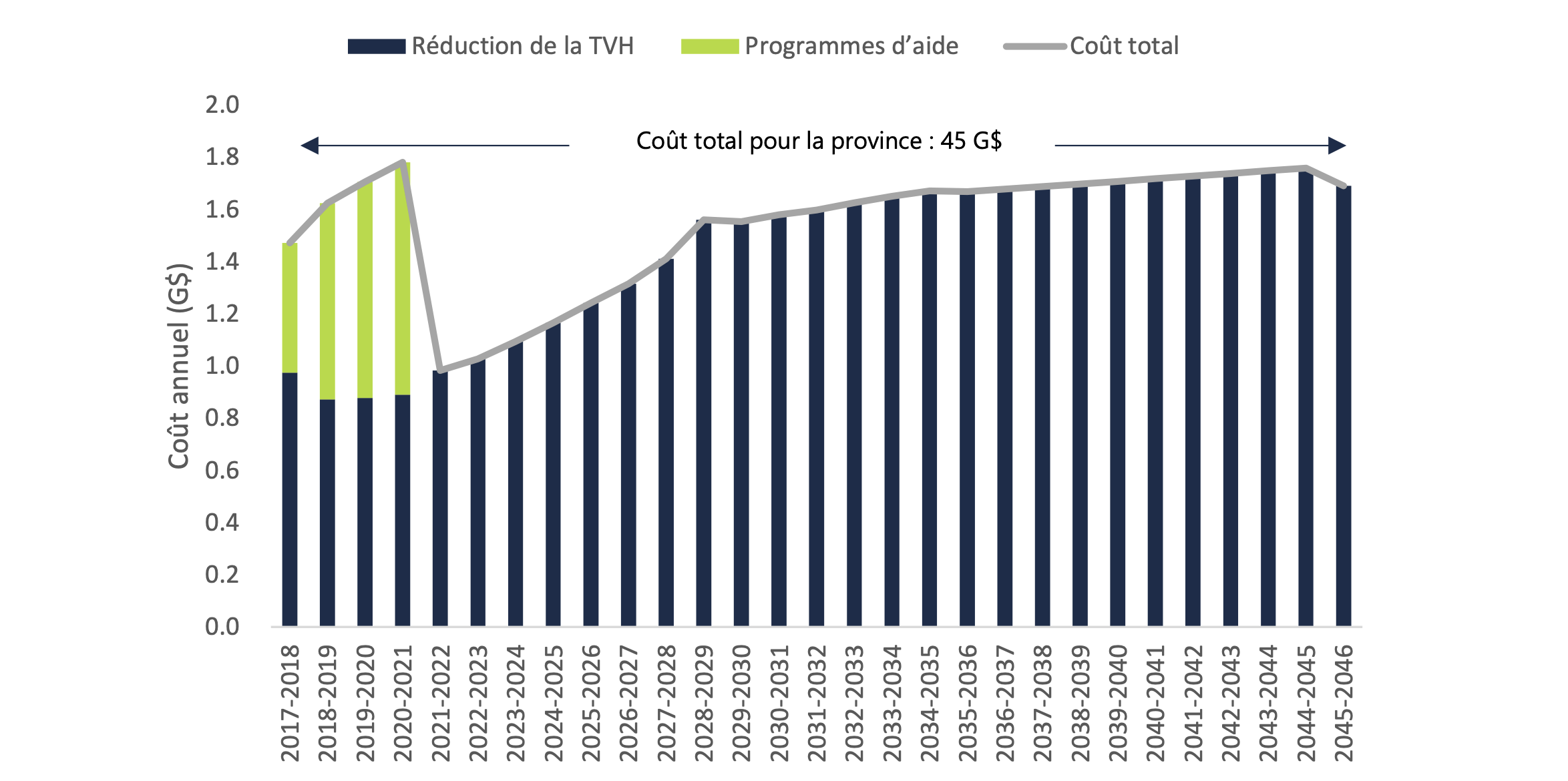 La Figure 3‑3 présente le coût annuel[16] du Plan jusqu’à 2045-2046 selon les estimations du BRF. Ce dernier prévoit un pic de 1,8 G$ en 2020-2021, après quoi il présume que la province cessera de financer les programmes d’aide aux frais d’électricité. La réduction de la TVH, qui devrait coûter 0,9 G$ en 2021-2022, se fera rapidement plus onéreuse : 1,6 G$ d’ici 2028-2029[17].