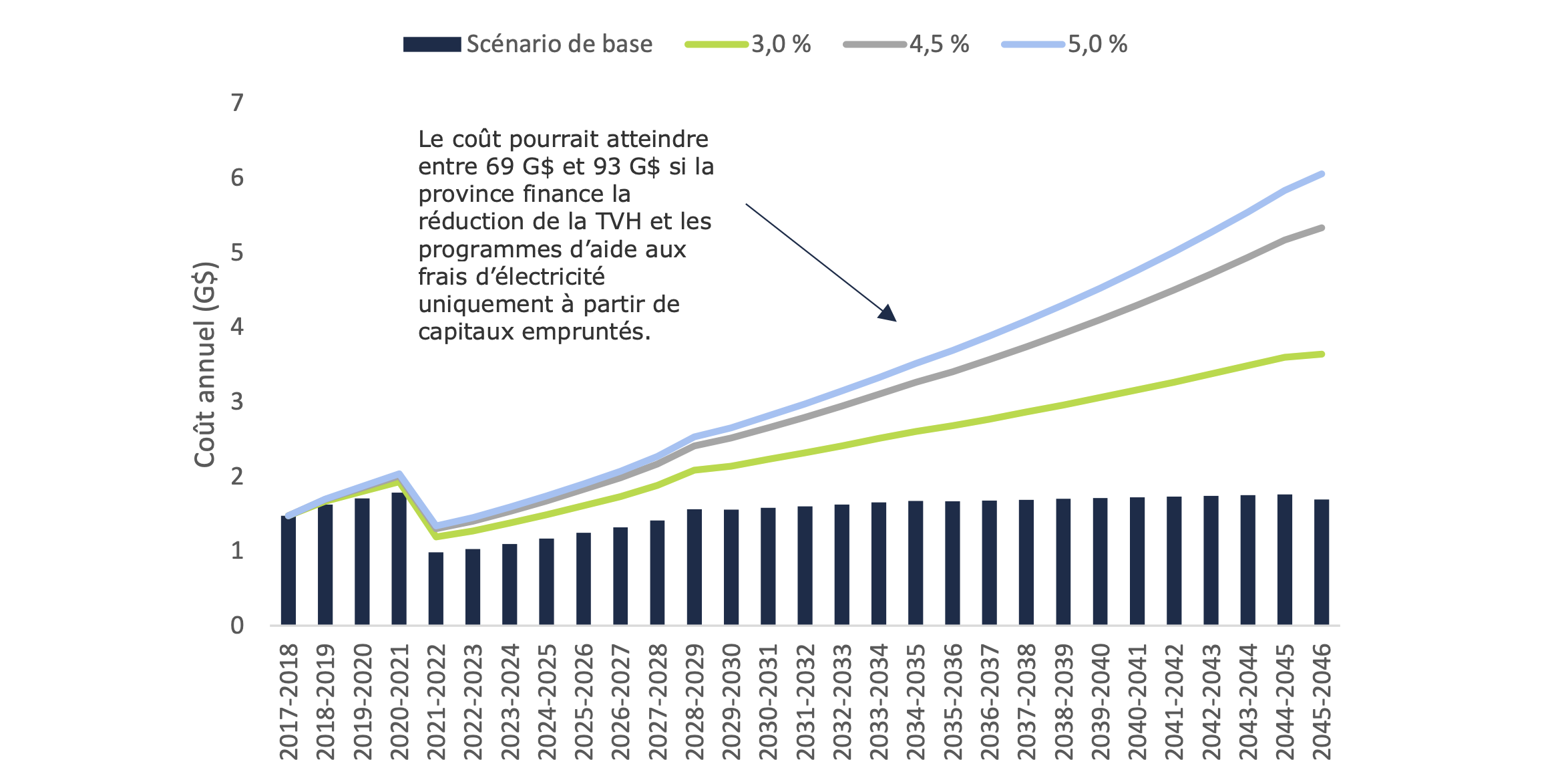 Les projections du coût pour la province, estimé à 45 G$ sur 29 ans, présupposent que cette dernière n’aura pas eu à emprunter pour financer le Plan. Si la province doit recourir à des capitaux empruntés, le coût qu’elle engagera pour le Plan pourrait grimper de 24 G$ à 48 G$, pour un coût total se situant entre 69 G$ et 93 G$[24].
