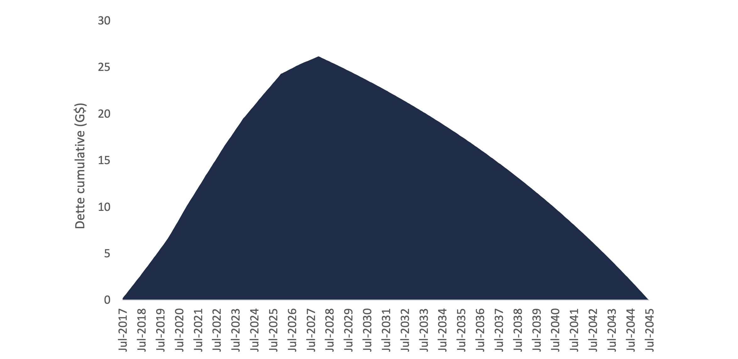Si le taux d’intérêt est de 5 %, la dette totale atteindra un pic de 26,2 G$ en 2027 (Figure 6‑2), après quoi ce solde sera amorti et remboursé par les consommateurs d’électricité admissibles de 2028 à 2045 par des paiements mensuels qui totaliseront 2,2 G$ par année.