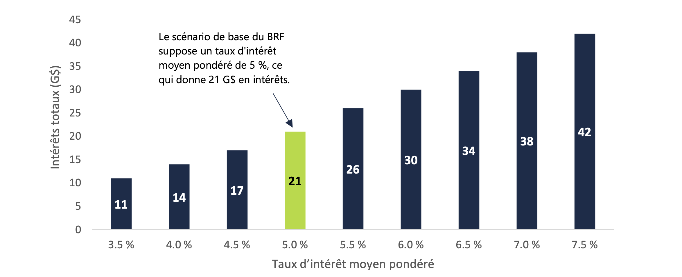 La figure illustre les estimations du BRF quant aux incidences de différents taux d’intérêt sur le montant des intérêts que les usagers auront à payer par suite du refinancement des frais d’électricité. Les chiffres sont donnés en milliards de dollars. La moyenne pondérée de 5 % pour le taux d’intérêt dans le scénario de base du BRF engendrerait un montant en intérêts estimé à 21 G$. Voici les estimations du montant des intérêts, en milliards de dollars, pour d’autres taux d’intérêt possibles : 3,5 % : 11; 4,0 % : 14; 4,5 % : 17; 5,0 % : 21; 5,5 % : 26; 6,0 % : 30; 6,5 % : 34; 7,0 % : 38; 7,5 % : 42