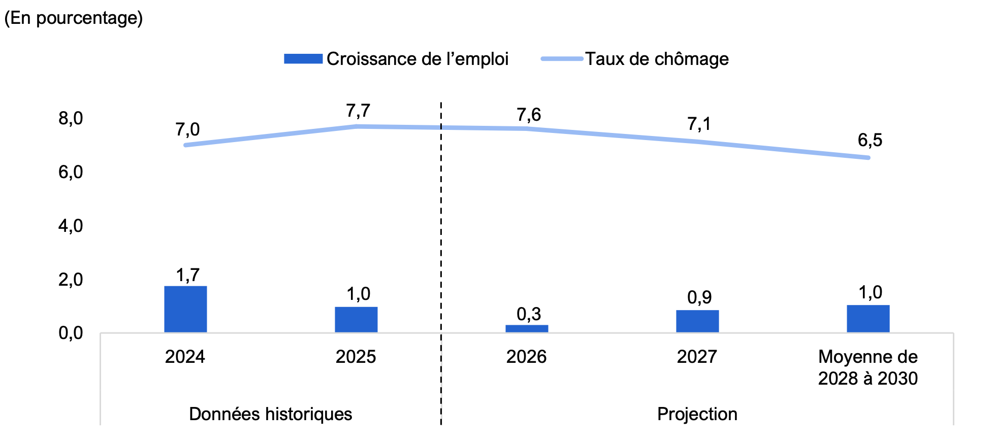 | Croissance de l’emploi | 1,7 | 1,0 | 0,3 | 0,9 | 1,0 |