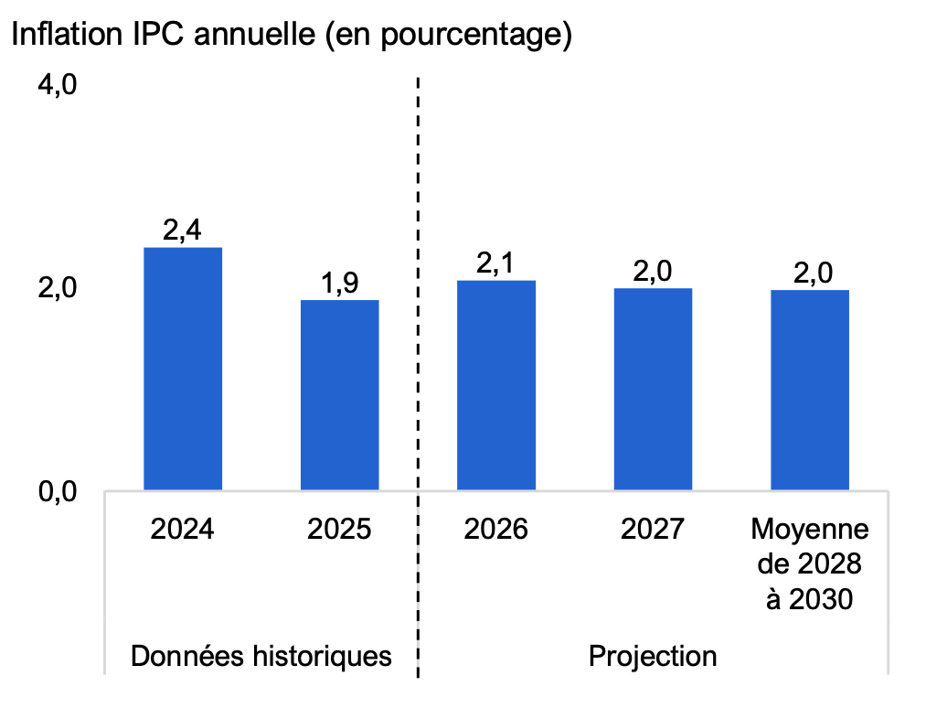 | Inflation IPC annuelle (en pourcentage) | 2,4 | 1,9 | 2,1 | 2,0 | 2,0 |