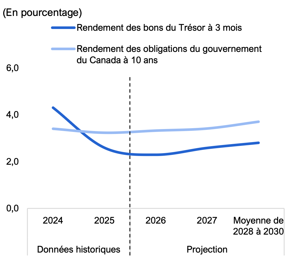 Depuis juin 2024, la Banque du Canada a abaissé son taux directeur de 275 points de base au total, pour le ramener à 2,25 %. Les acteurs des marchés financiers prévoient que la Banque du Canada maintiendra son taux directeur inchangé en 2026[3]. Selon le BRF, les taux d’intérêt à court et à long terme augmenteront au cours de la période visée par les perspectives, le rendement des bons du Trésor à trois mois devant s’établir en moyenne à 2,8 % et celui des obligations du gouvernement du Canada à dix ans à 3,7 % de 2028 à 2030.
