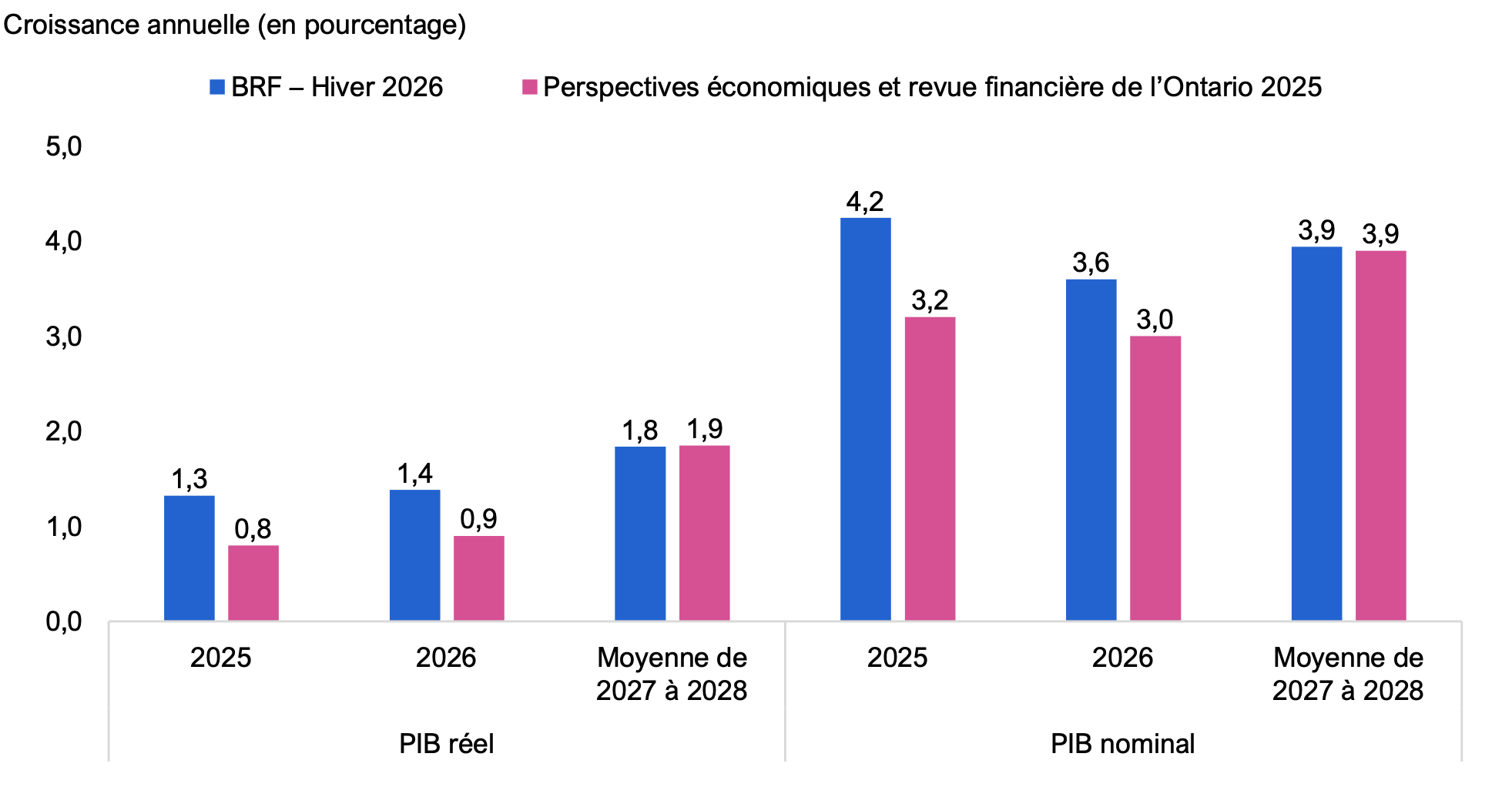 Comparativement aux perspectives économiques du gouvernement présentées dans le document Perspectives économiques et revue financière de l’Ontario 2025, les projections du BRF pour la croissance du PIB réel et du PIB nominal sont plus élevées en 2025 et 2026, car elles sont fondées sur des données économiques plus récentes qui indiquent une augmentation des revenus du travail, des bénéfices des entreprises et de la consommation des ménages. En 2027 et 2028, les projections du BRF pour la croissance des PIB réel et nominal sont similaires à celles du gouvernement.