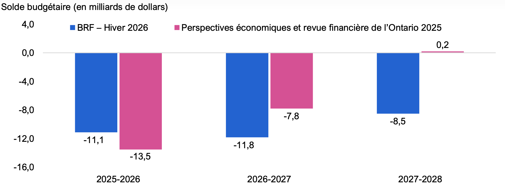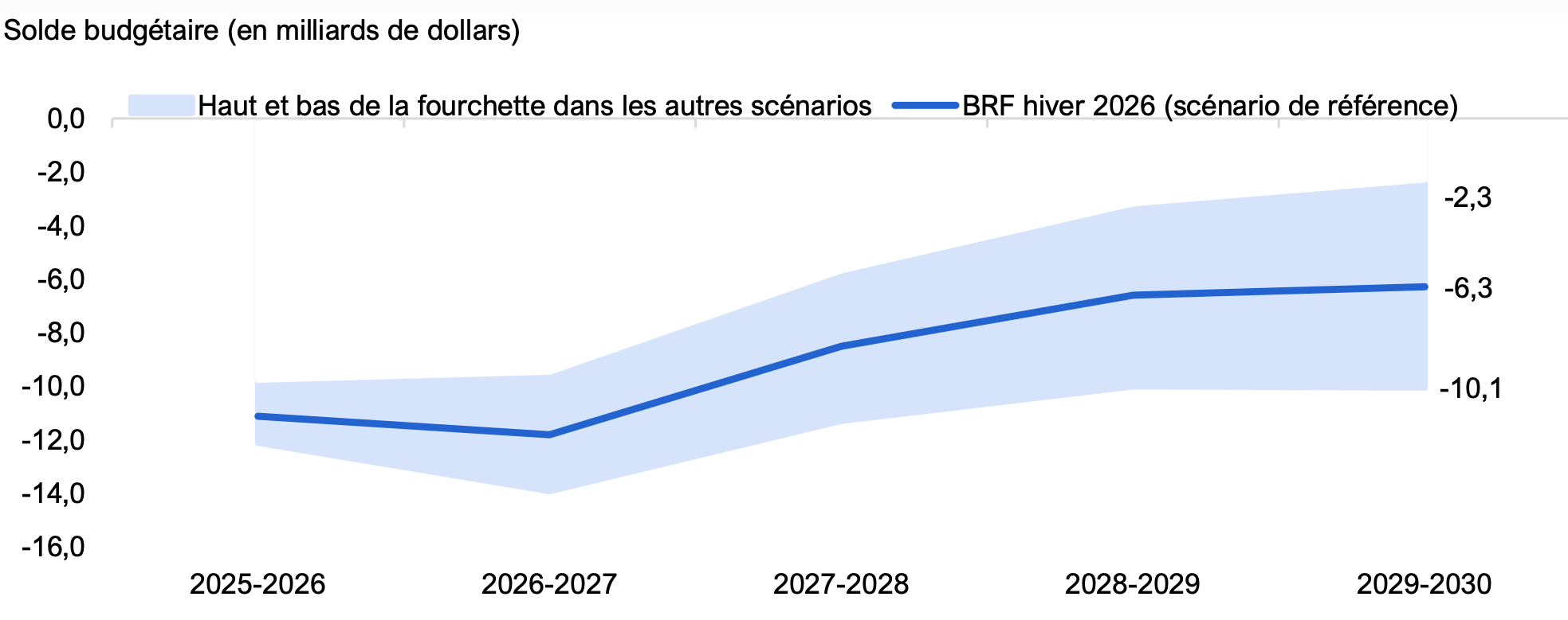 On prévoit que le déficit budgétaire atteindra 11,8 milliards de dollars en 2026-2027, pour ensuite s’améliorer graduellement au cours du reste de la période visée par les perspectives. Malgré cette amélioration, le budget devrait rester déficitaire pendant toute la période des perspectives, avec un déficit budgétaire prévu de 6,3 milliards de dollars en 2029-2030.