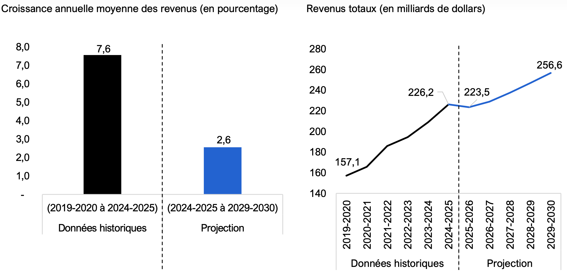 | (En milliards de dollars) | 2023-2024r | 2024-2025r | 2025-2026p | 2026-2027p | 2027-2028p | 2028-2029p | 2029-2030p |